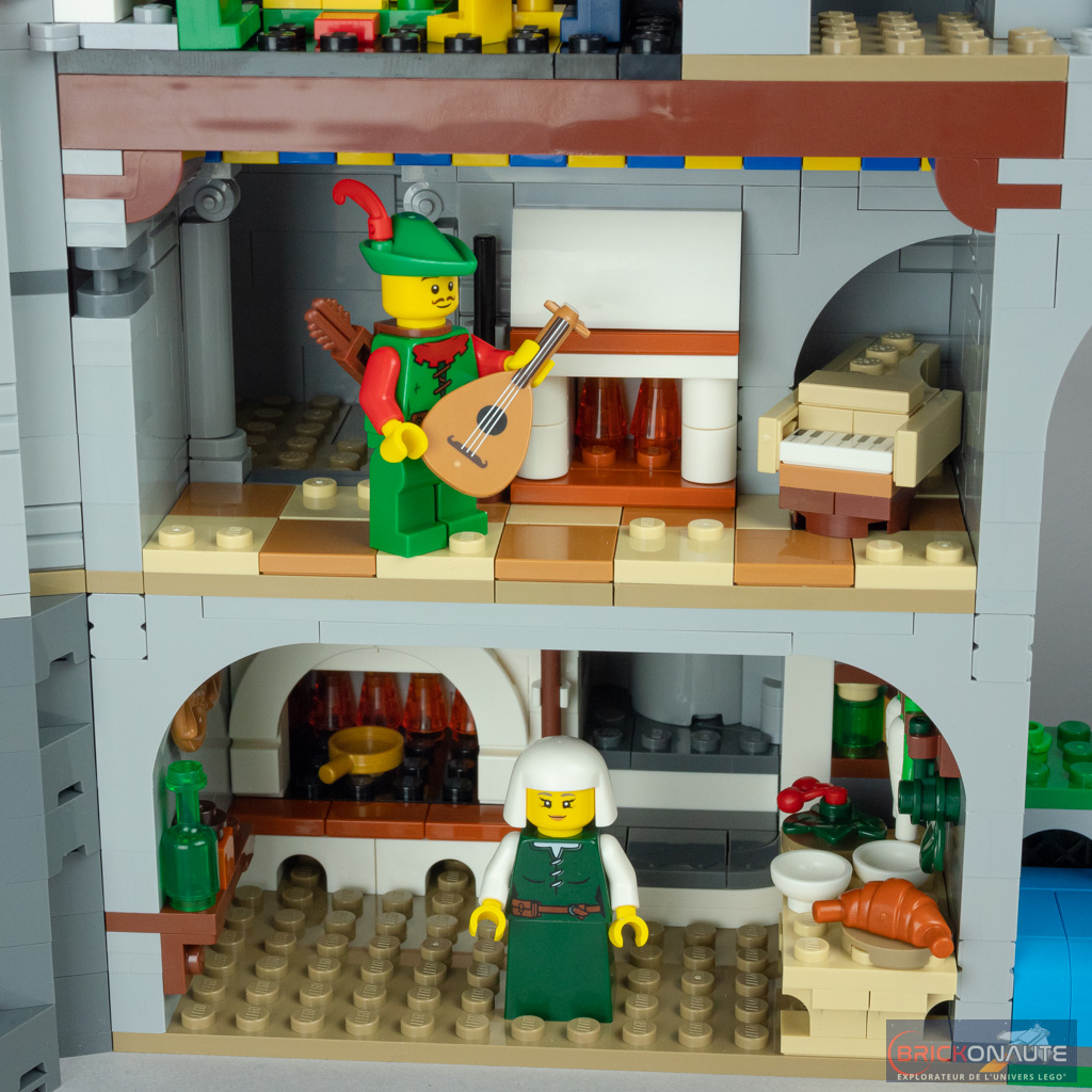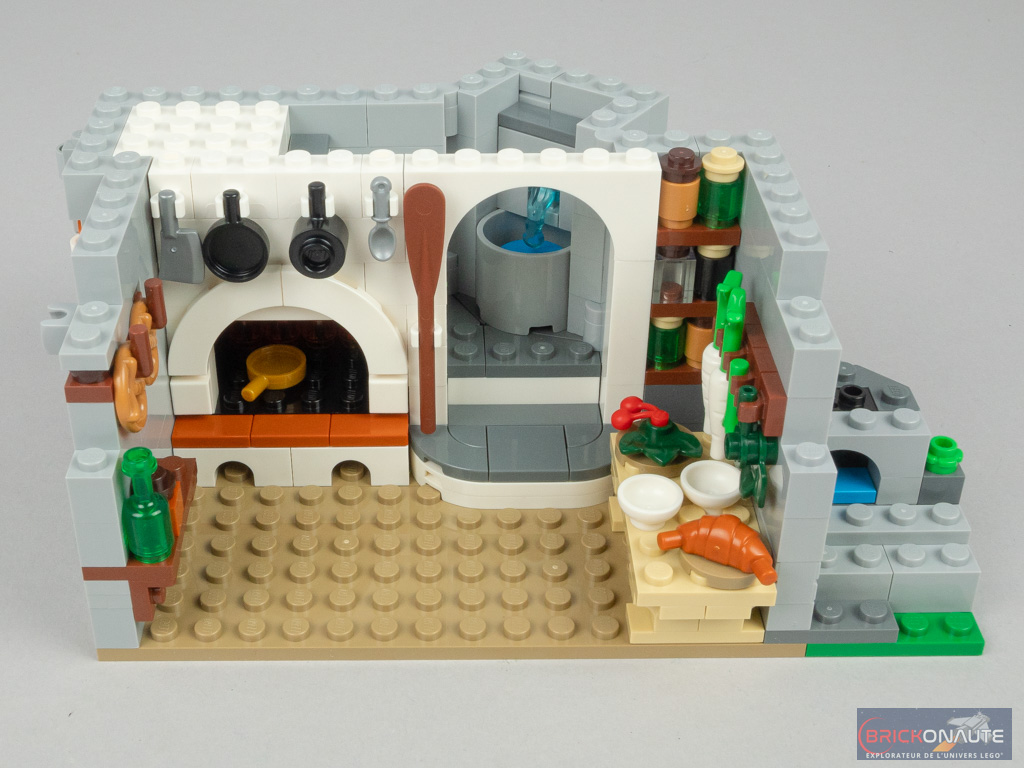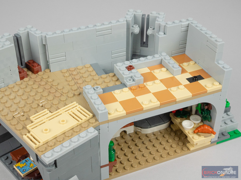 On continue l’aménagement intérieur de cette première pièce, qui s’avère être la cuisine du château. On y ajoute un four à pain, un point d’eau et quantité de provisions et d’ustensiles de cuisine. On continue d’élever les murs en ajoutant notamment de nouvelles charnières et on termine cette étape avec le plancher du niveau supérieur. Au fond de la salle, on remarquera l’escalier entre les deux niveaux. Premier constat à ce stade de la construction : la pièce est suffisamment profonde pour y imaginer une grande variété de mises en scène. Revers de la médaille, il est un peu difficile d’accéder au fond, du moins avec des mains d’adulte, pour y récupérer les différents accessoires par exemple.