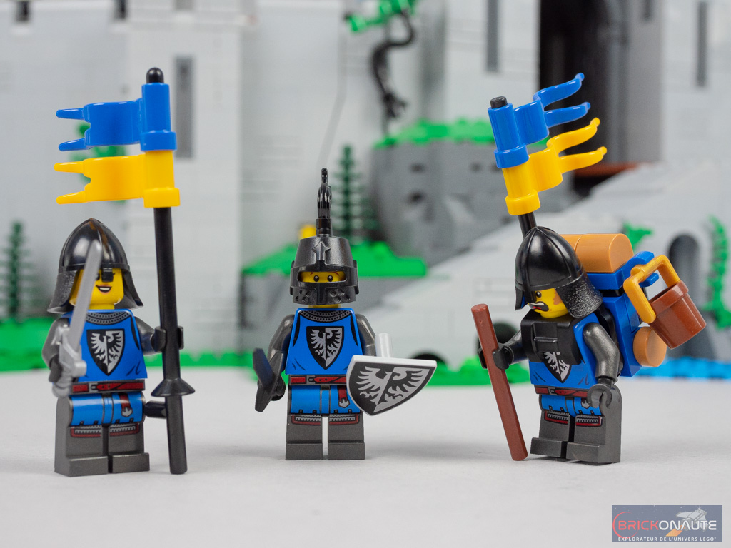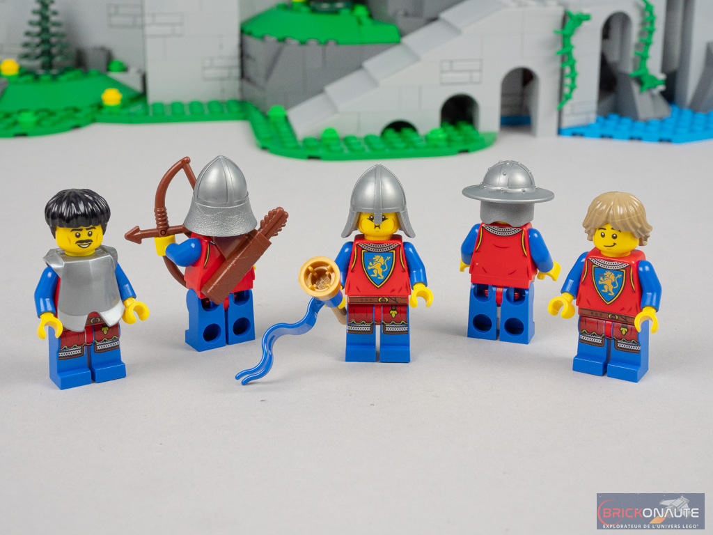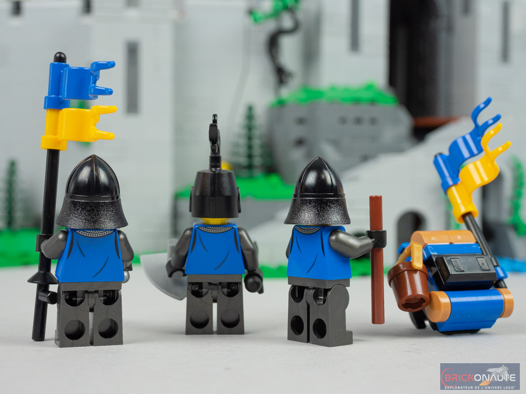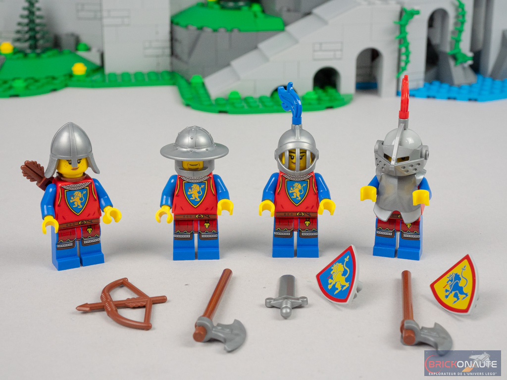 Autre bon point en termes de jouabilité, la grosse sélection de minifigs. Je vous laisse lire le chapitre détaillé que je leur consacre un peu plus haut pour en savoir plus à leur sujet, mais elles sont globalement très bien réalisées. Si on pourra considérer qu’elles ne sont pas si variées que cela (avec par exemple 9 Chevaliers du Lion sur les 21 personnages), on se ravisera en observant la très grande variété de têtes, de casques, d’armes et d’accessoires aussi divers que variés qu’elles peuvent porter.