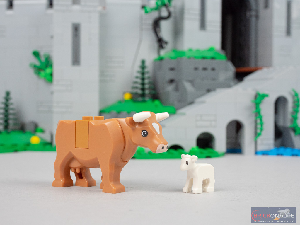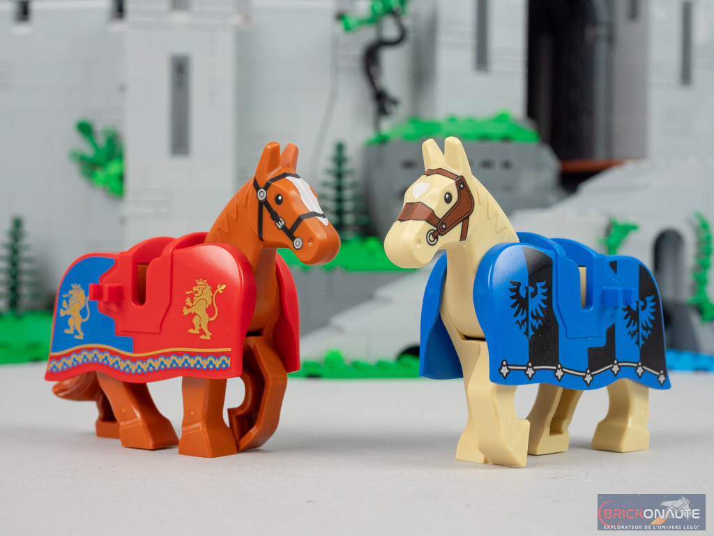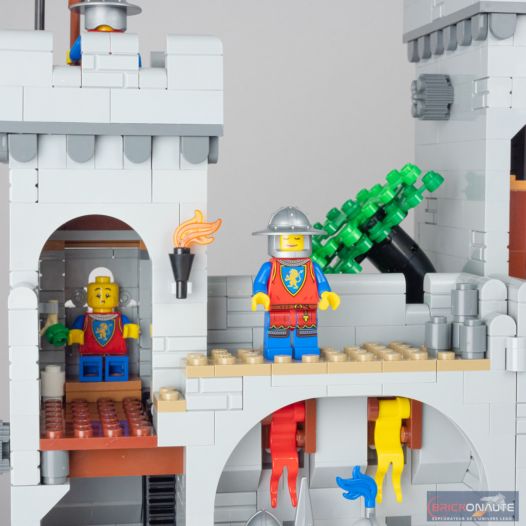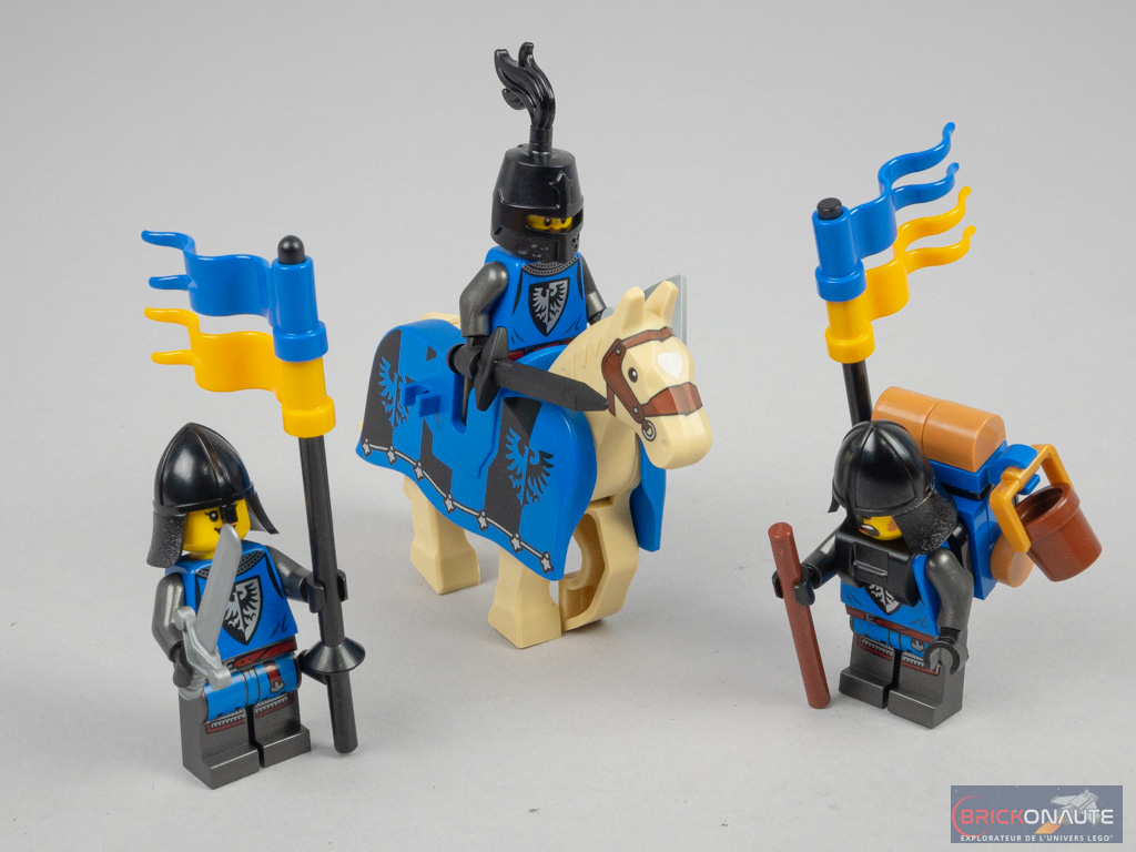 Autre bon point en termes de jouabilité, la grosse sélection de minifigs. Je vous laisse lire le chapitre détaillé que je leur consacre un peu plus haut pour en savoir plus à leur sujet, mais elles sont globalement très bien réalisées. Si on pourra considérer qu’elles ne sont pas si variées que cela (avec par exemple 9 Chevaliers du Lion sur les 21 personnages), on se ravisera en observant la très grande variété de têtes, de casques, d’armes et d’accessoires aussi divers que variés qu’elles peuvent porter.
