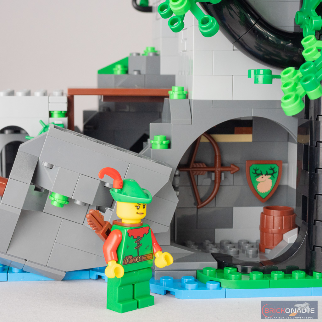 Parmi les références plus ou moins évidentes, on notera par exemple le grand arbre noir caractéristique des sets de l’époque, ou la cachette des Forestmen accessible de la même manière que dans le set 6066 Camouflaged Outpost (pour lequel je vous invite à découvrir la mini-critique de MetalSonic à cette adresse) en faisant pivoter un rocher. Les références se trouvent également dans les nombreux blasons, que vous avez peut-être reconnus, et dans les différents personnages proposés associés aux différentes factions.
