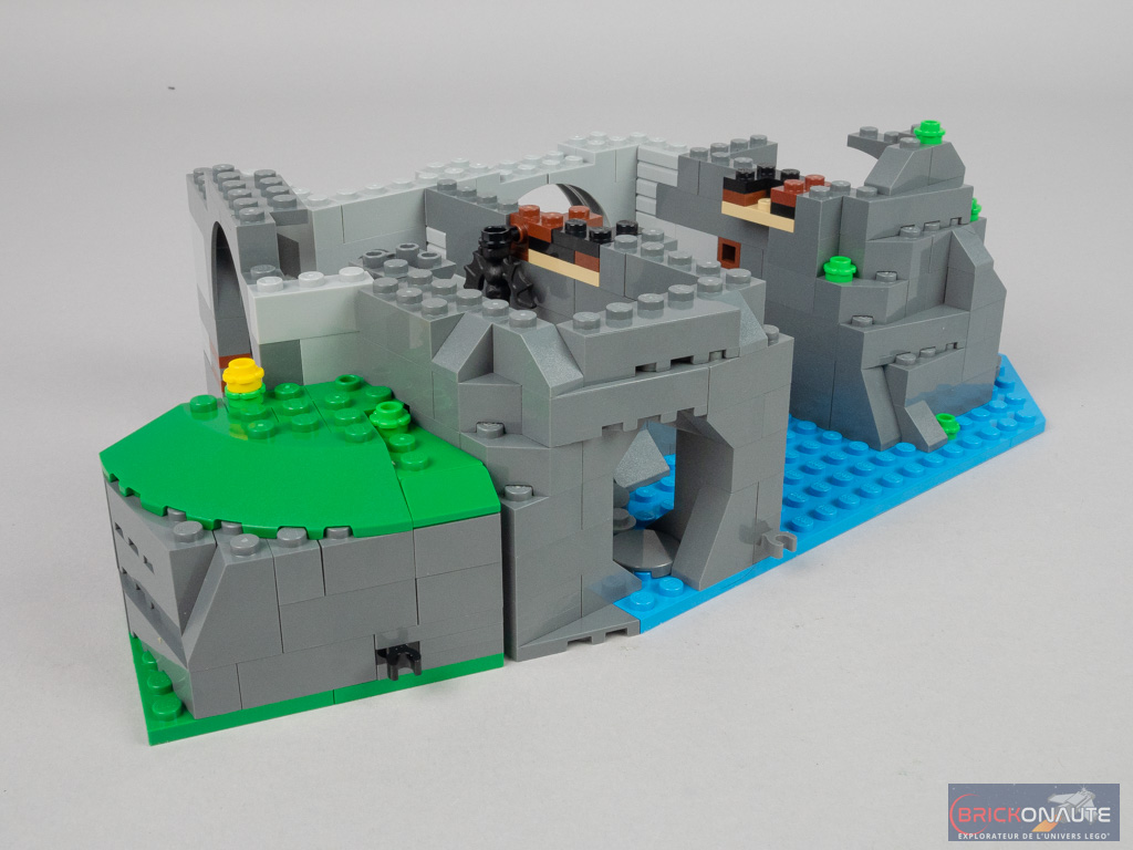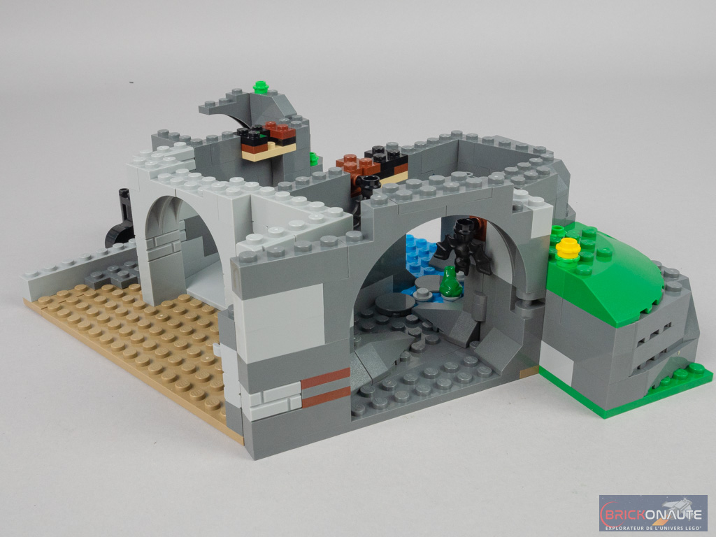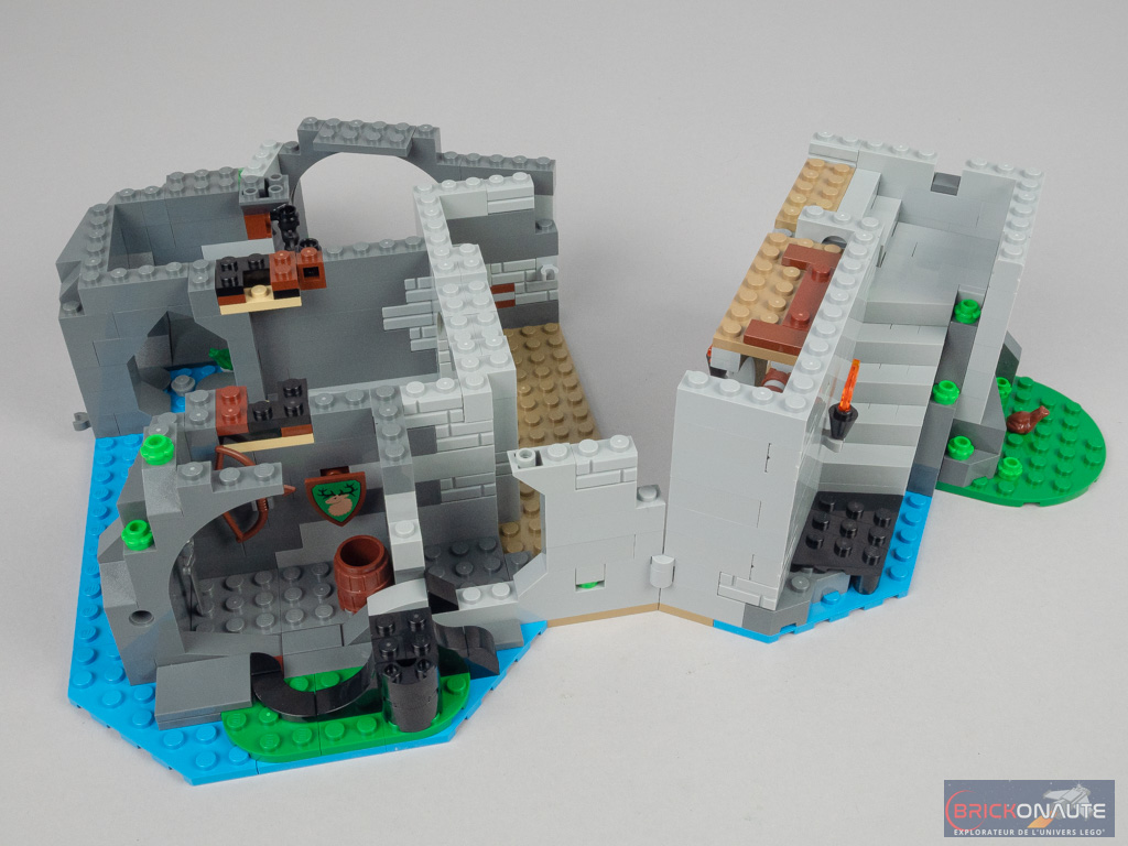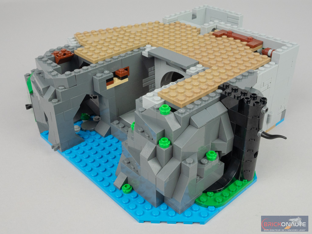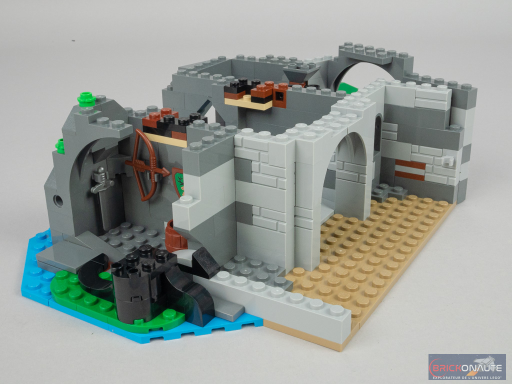 Nous continuons sur ce même module en élevant les parois pour constituer notamment plusieurs arches, futurs chemins d’accès au repaire caché des Forestmen. Côté extérieur, ce sont quelques rochers posés dans l’eau. Côté intérieur, on assemble deux cavernes peuplées de chauves-souris et un repaire caché contenant l’insigne des Forestmen ainsi que quelques armes.