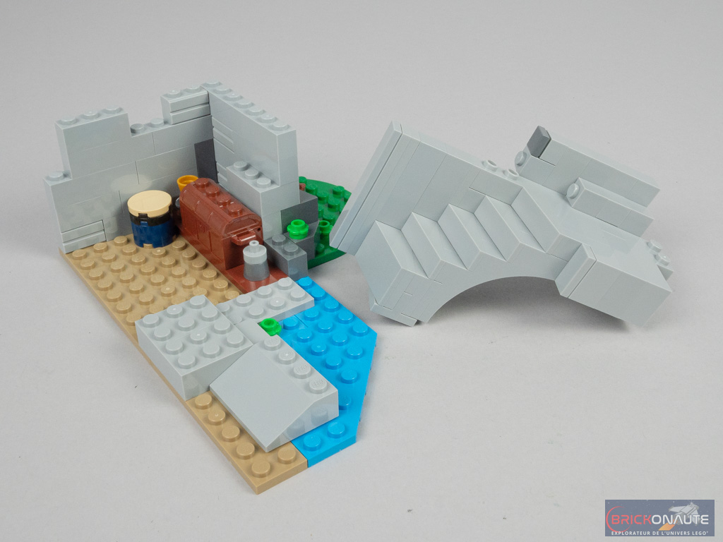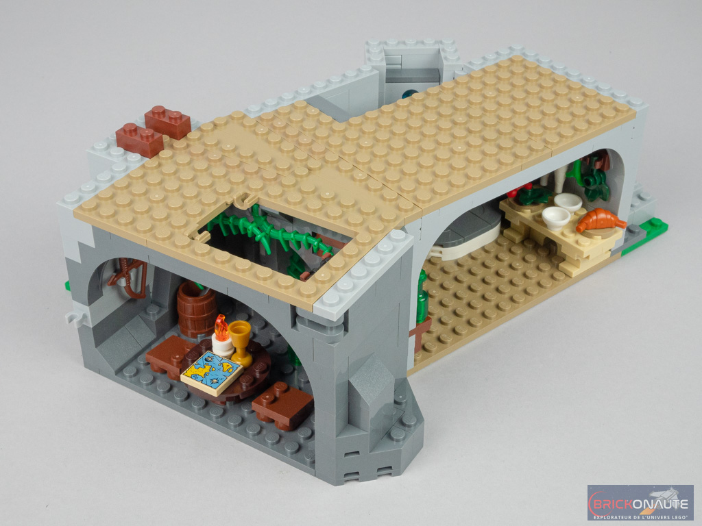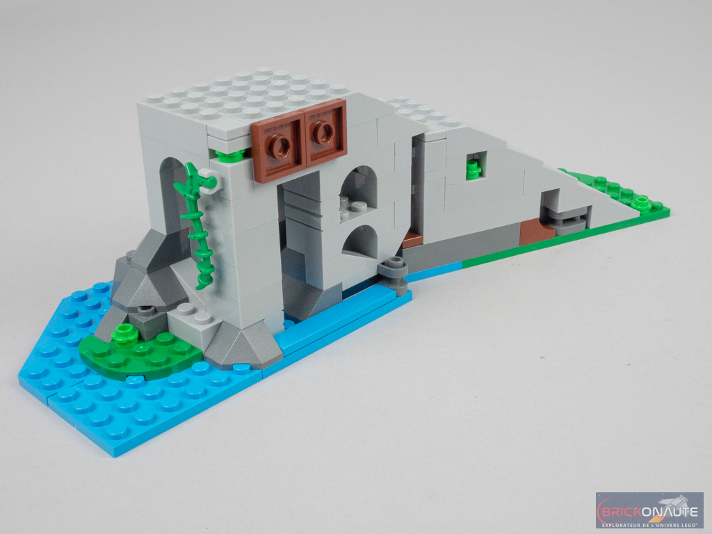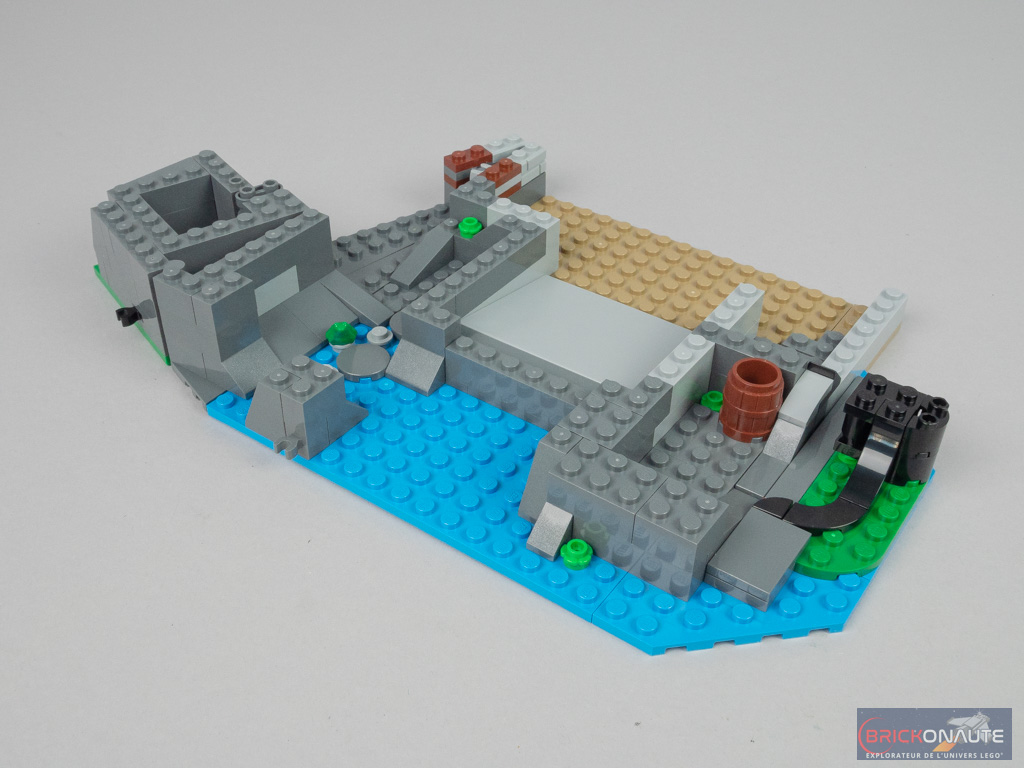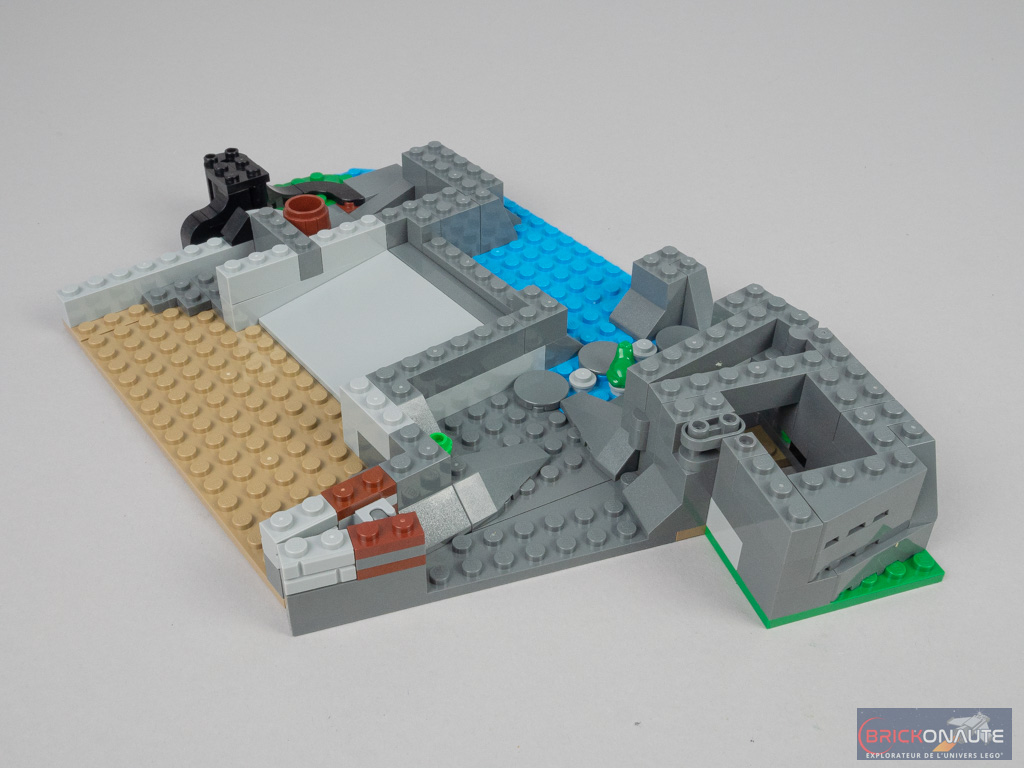 Nous continuons sur ce même module en élevant les parois pour constituer notamment plusieurs arches, futurs chemins d’accès au repaire caché des Forestmen. Côté extérieur, ce sont quelques rochers posés dans l’eau. Côté intérieur, on assemble deux cavernes peuplées de chauves-souris et un repaire caché contenant l’insigne des Forestmen ainsi que quelques armes.
