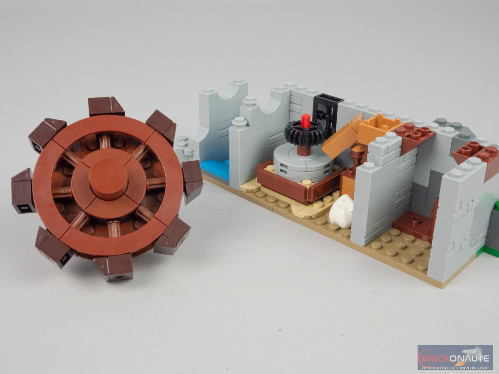On construit ensuite la roue à aubes, qui vient se loger dans les pièces en forme d’arche inversée situées de part et d’autre du ruisseau. Un engrenage, côté intérieur, permet de mettre en mouvement la meule. On ajoute aussi quelques aménagements intérieurs, et on termine en ajoutant le plancher supérieur.