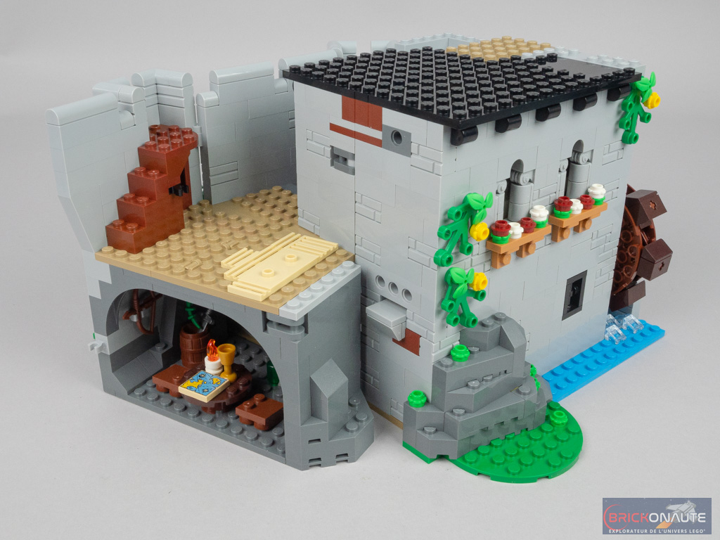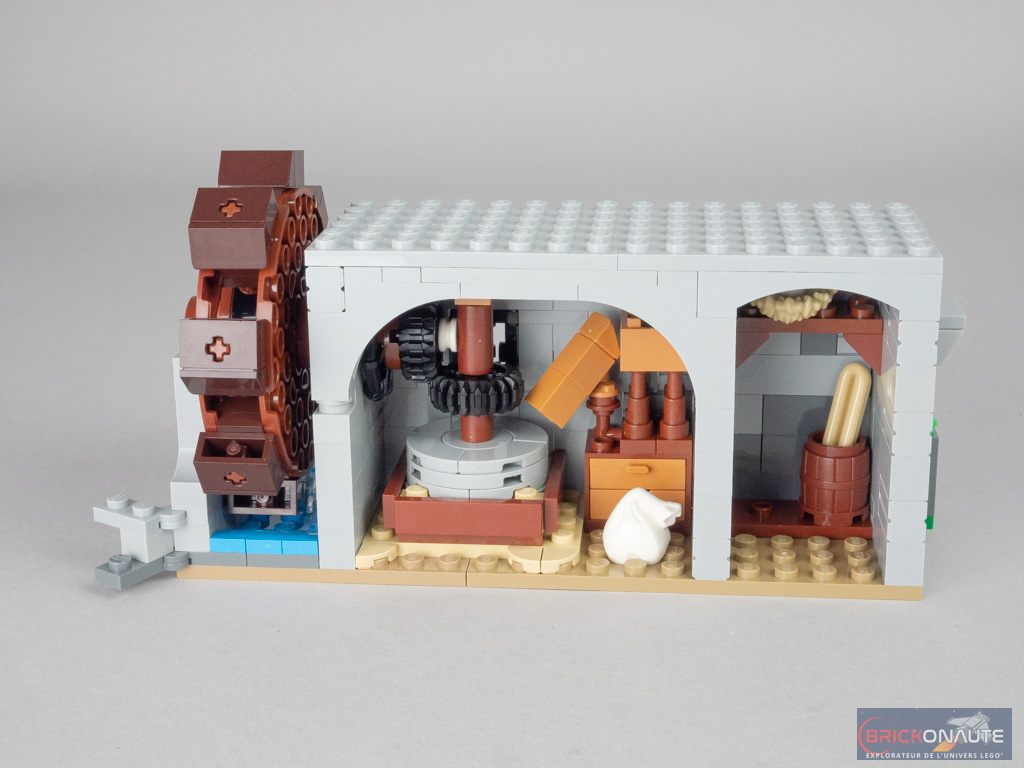 On attaque ensuite un nouveau « module », avec le rez-de-chaussée qui donne sur un petit cours d’eau. Côté intérieur, on trouve une meule et un tonneau qui contient une baguette de pain. Remarquez ici la manière de réaliser la petite fenêtre à base de jumpers. Côté extérieur, l’ensemble s’adosse sur des éléments rocheux.