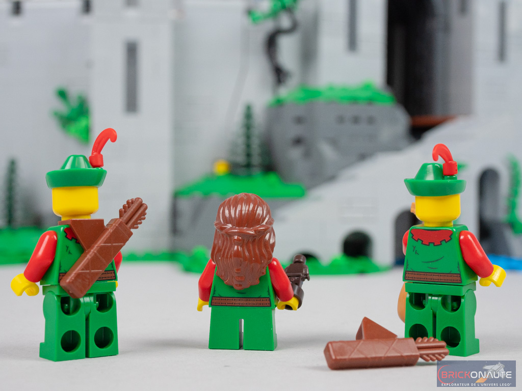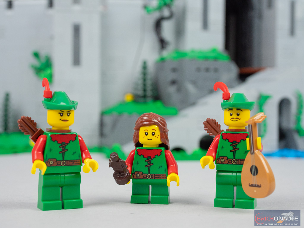 Une autre faction dispose de 3 personnages également, dont un enfant : les Forestmen. Leur tenue est identique à celle qu’ils portent dans le petit set 40567 Forest Hideout – un gilet vert au-dessus d’un haut rouge, avec une ceinture disposant d’une petit poche, et leur fameux couvre-chef. La encore, le rouge du col est un peu terne… On notera un bel accessoire avec le luth.