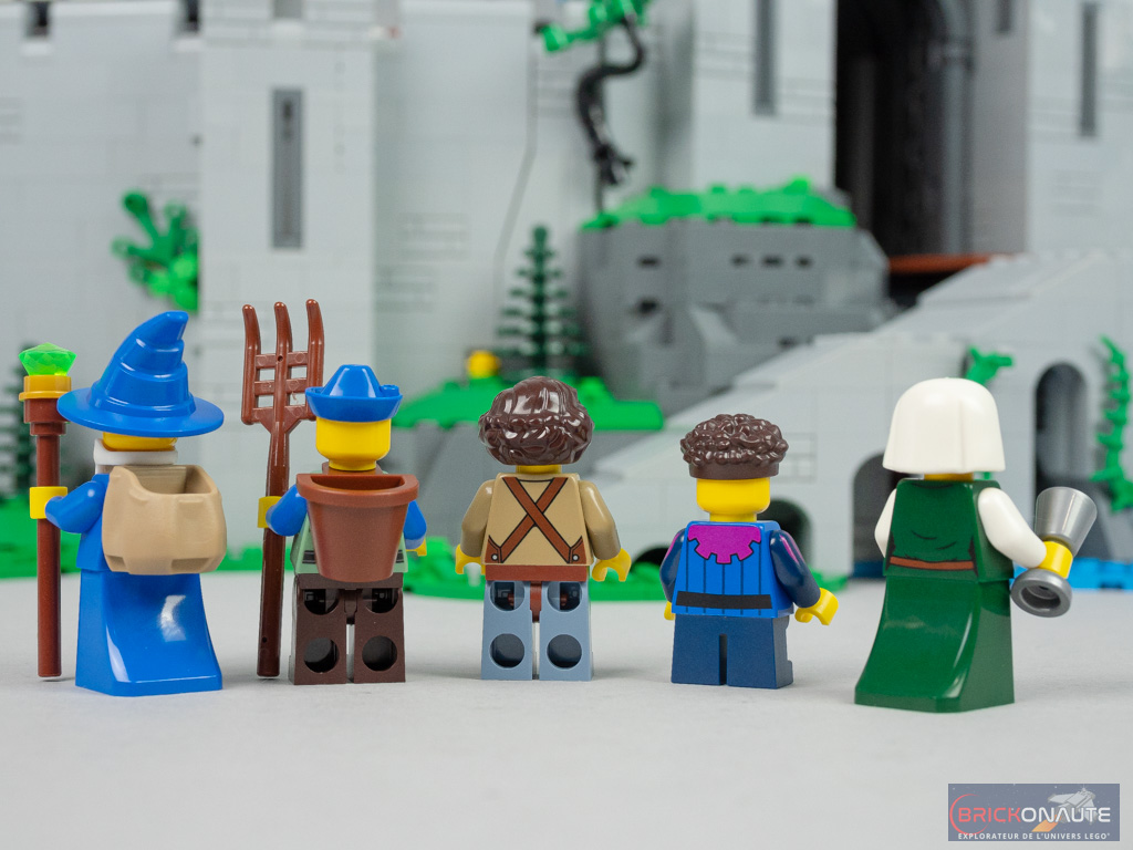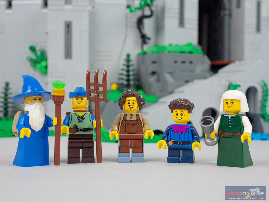 Enfin, 5 autres personnages sont de la partie. Pour le magicien Majisto, LEGO ne s’est pas foulé et nous propose un personnage complètement vierge, c’est un peu dommage pour son grand retour… On trouve également plusieurs villageois dont un fermier armé de sa fouche, probablement le boulanger / cuisinier du château avec son tablier, une villageoise en robe et un jeune garçon.