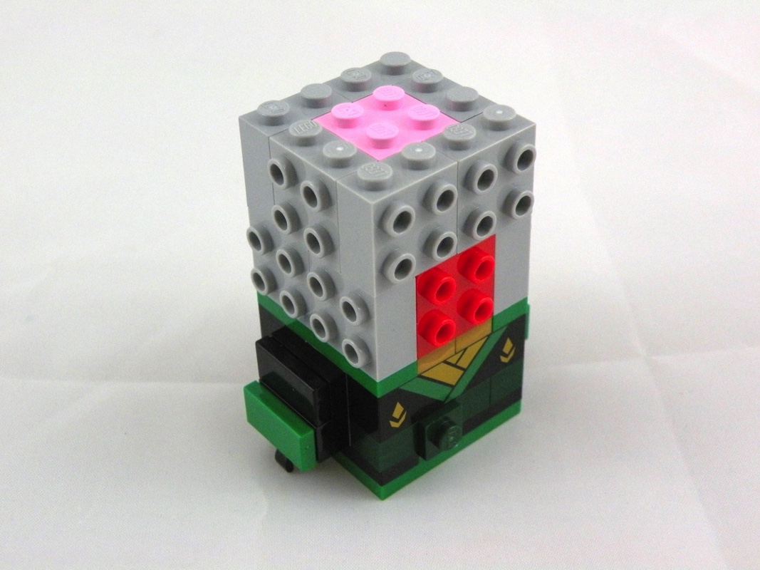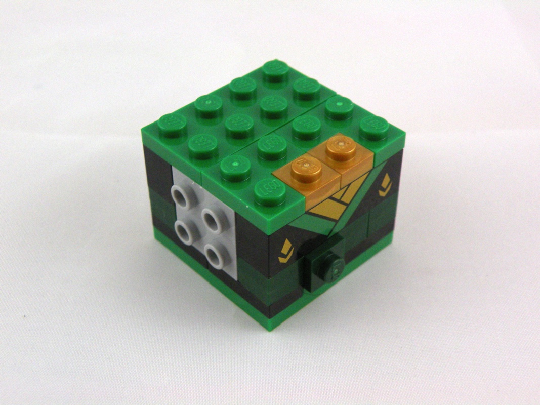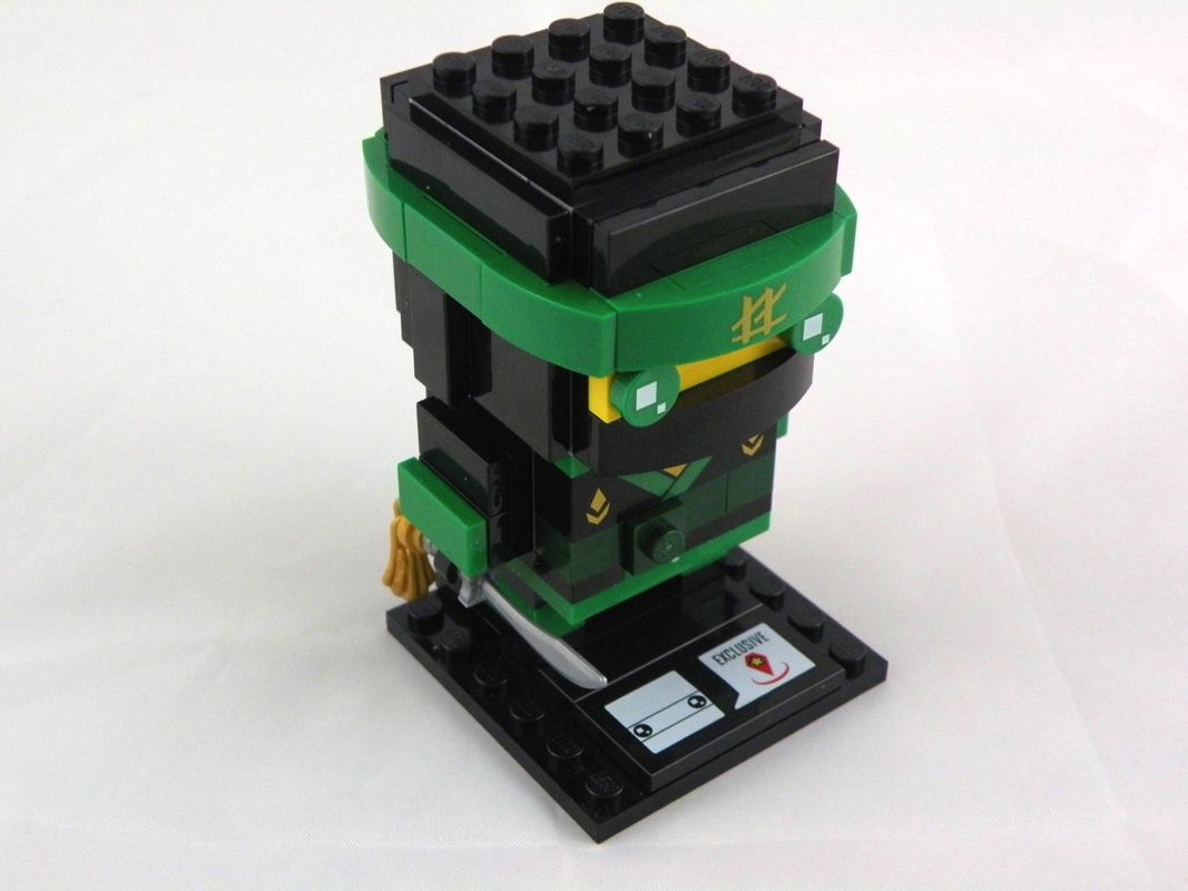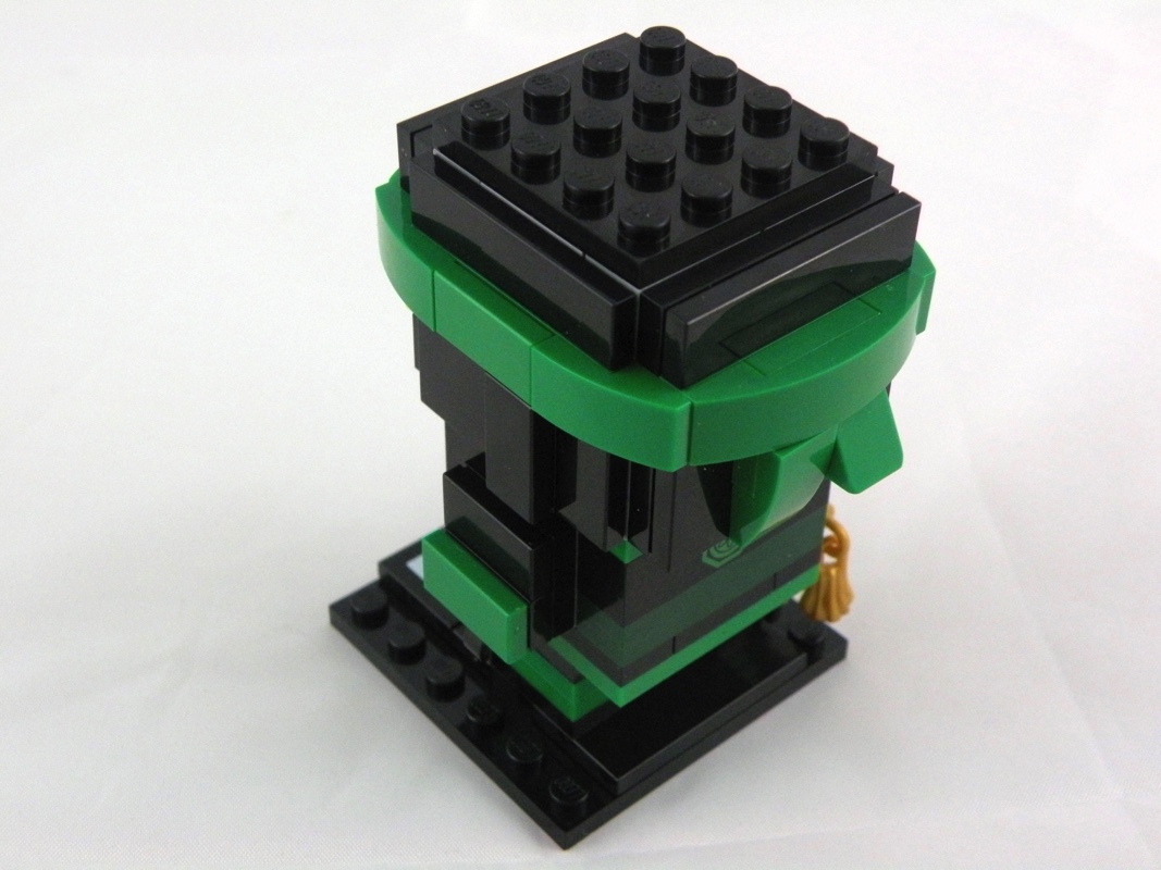 On continue avec l’assemblage de notre modèle avec la construction de la tête, basée sur une structure intérieure de 12 Brick, Modified 1 x 2 x 1 2/3 with Studs on 1 Side, traditionnelle dans cette gamme. On l’habille pour l’essentiel de tiles noires, y compris au niveau des oreilles qui dépassent légèrement. On ajoute également une touche de jaune, pour la partie visible du visage, et les deux yeux verts de Lloyd, ainsi que le bandeau vert et sa très belle pièce tampographiée. On apprécie également le soin apporté à la réalisation du noeud du bandeau, simple mais convaincant. Seul petit regret ici, afin de conserver une uniformité dans la réalisation de la cagoule, il aurait été préférable de ne pas avoir de tenons visibles sur le haut de la tête.