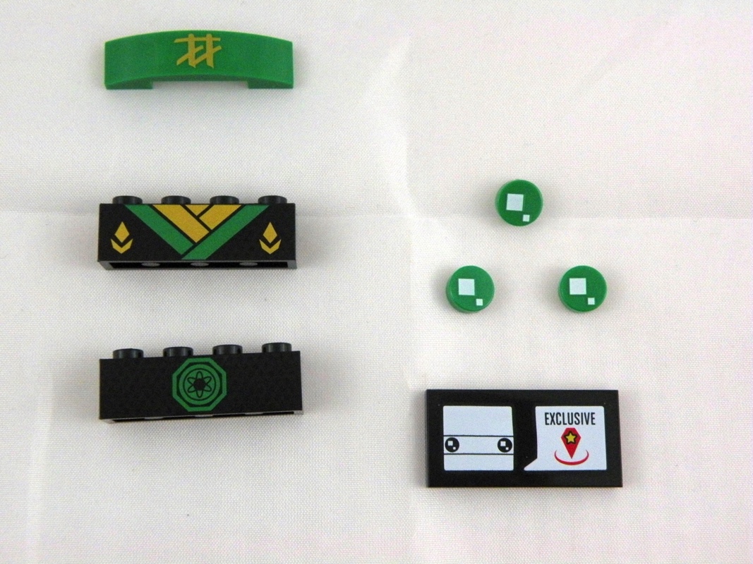 A l’intérieur, deux sachets de pièces, une plaque de base de 6×6 tenons, et une notice d’instructions de 32 pages pliée en deux. Parmi les pièces intéressantes, comme toujours dans cette gamme, un certain nombre de pièces tampographiées. On retrouve ici le torse et le dos de la tenue de ninja, le bandeau, les yeux (verts, ça change), sans oublier la tile signalétique.