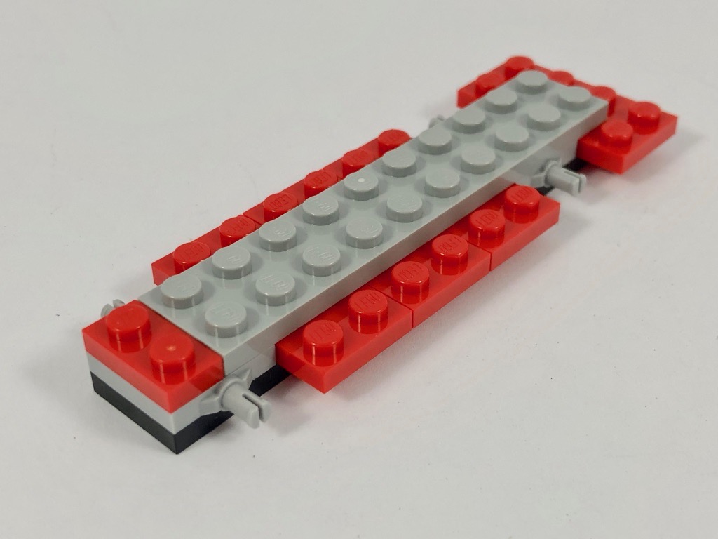 La construction est, comme on pouvait s’y attendre, très simple. On empile les briques du 1er niveau et quelques briques SNOT pour y fixer la calandre, les feux et la plaque d’immatriculation.
