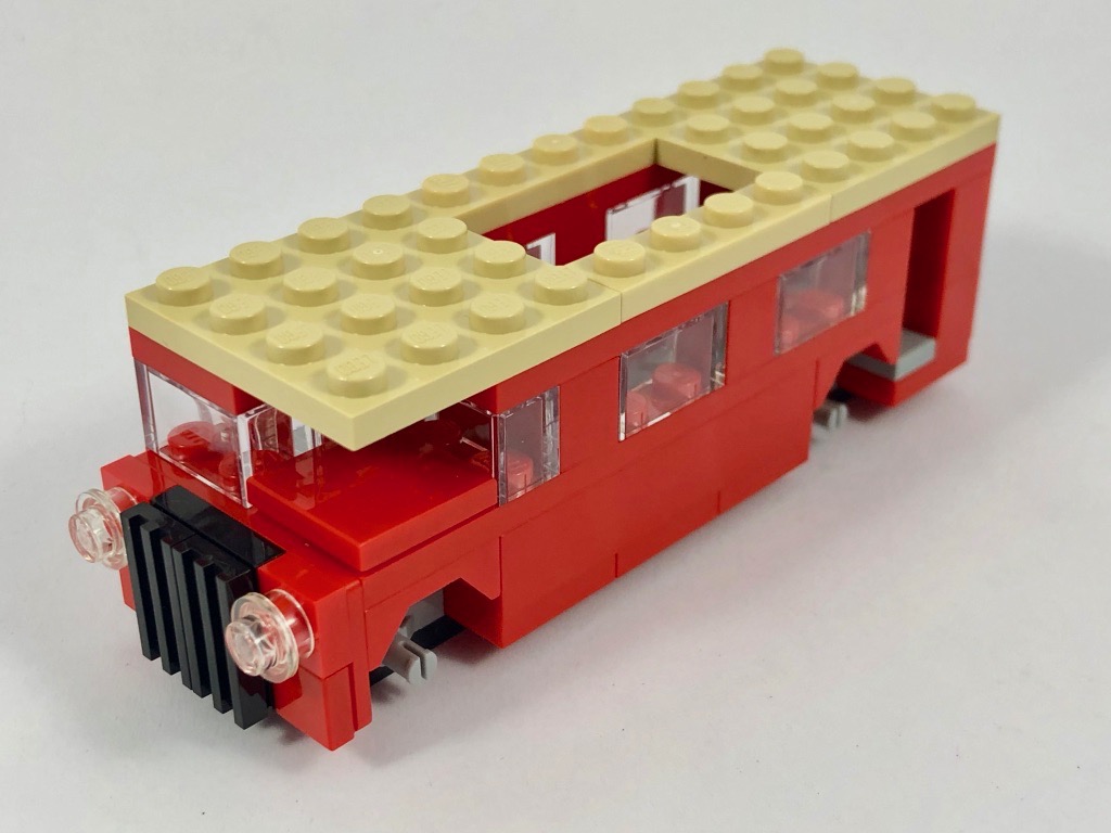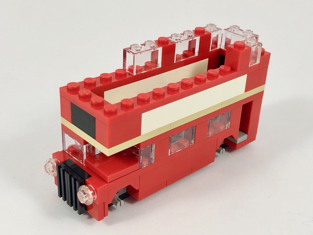 Puis on ajoute le plancher du 2ème niveau, avant d’ajouter deux grandes briques blanches qui seront ornées chacune d’un autocollant. L’un des deux fait de la publicité pour le film The Brick Separator, référence à l’affiche qu’on peut trouver au rez-de-chaussée du modular 10232 – Palace Cinema. On ajoute les vitres, et 4 briques incurvées situées aux 4 coins donnent au bus sa forme caractéristique. On termine avec la toiture et les 4 roues.