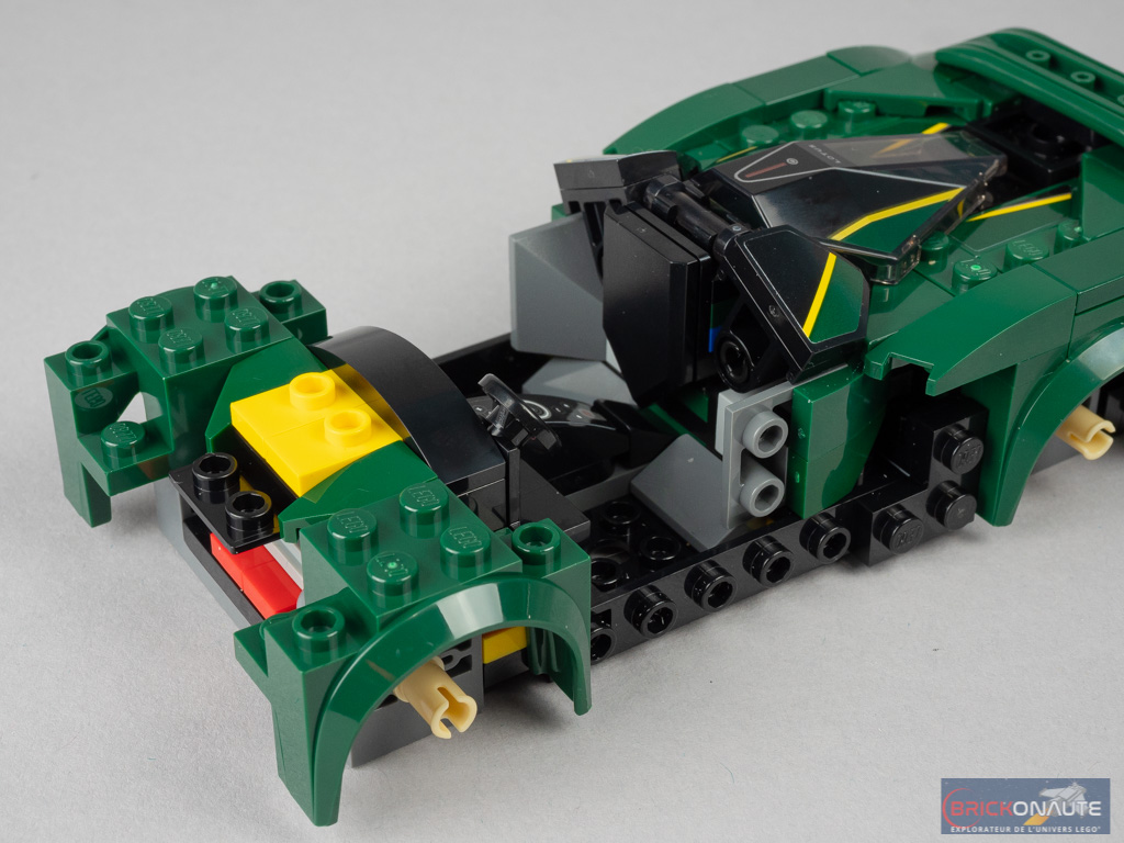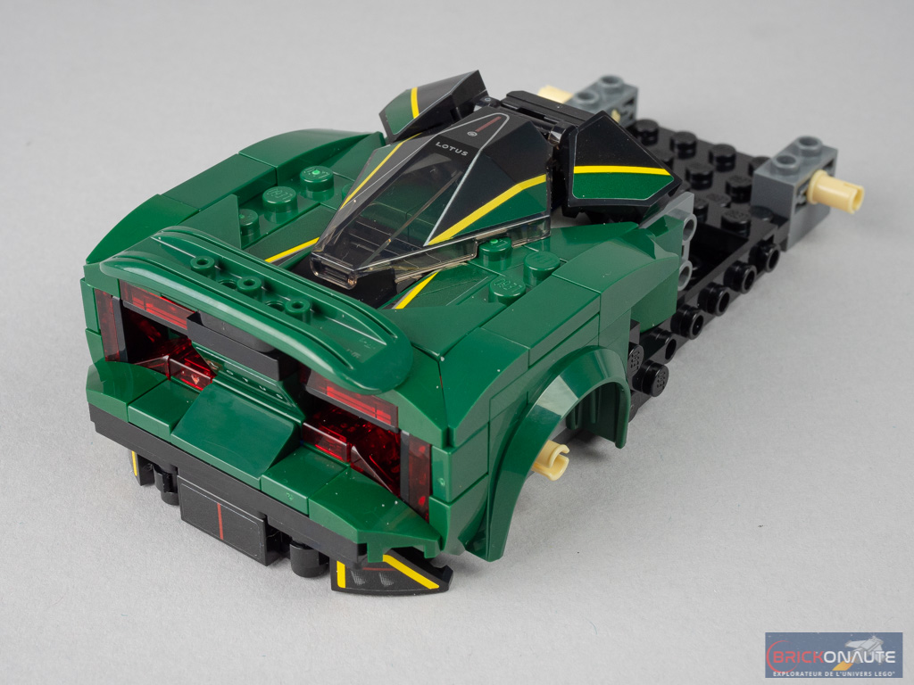 Avec le premier sachet de pièces, on s’intéresse particulièrement à l’arrière de la voiture. Et comme souvent avec cette gamme, on observe de jolies techniques de construction, notamment ici pour la réalisation des optiques arrières alambiquées de la machine d’origine. Tout ceci reste un peu « carré », mais globalement le designer s’en tire plutôt bien. Petit regret ici, le mot « Lotus » est situé sur un autocollant. Je pense que ce type de pièces mériterait d’être tampographié. Remarquez aussi le joli travail sur les grosses entrées d’air situées à l’arrière des portières – et évidemment la très jolie pièce tampographiée en guise de lunette arrière.