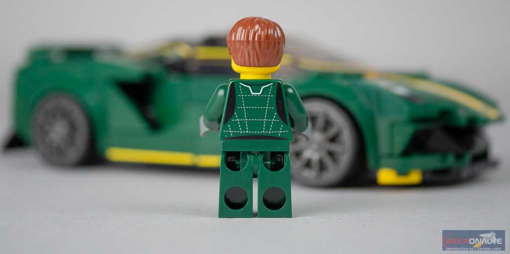 Le pilote porte une tenue aux couleurs de son bolide, et accessoirement du constructeur. La réalisation est fine et soignée, même si on regrettera un raccord imparfait au niveau du bassin. C’est devenu la norme désormais et c’est tant mieux : la minifig est livrée avec un casque de pilote, mais également des cheveux. La tête et les cheveux sont relativement communs : on les trouve dans une quinzaine de sets.