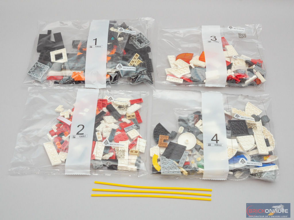 À l’intérieur, on trouve 4 sachets de pièces numérotés et 3 tiges flexibles jaunes, une notice d’instructions de 128 pages pour 235 étapes de construction, et une petite planche de 9 autocollants.