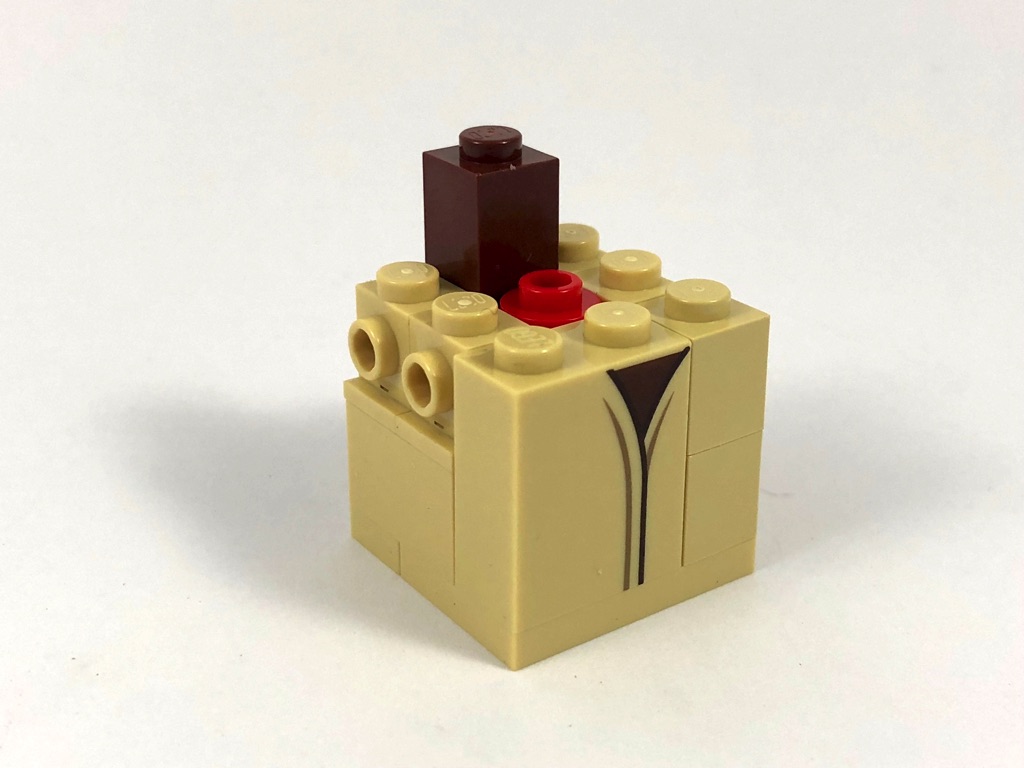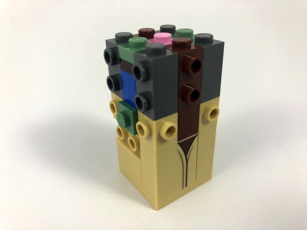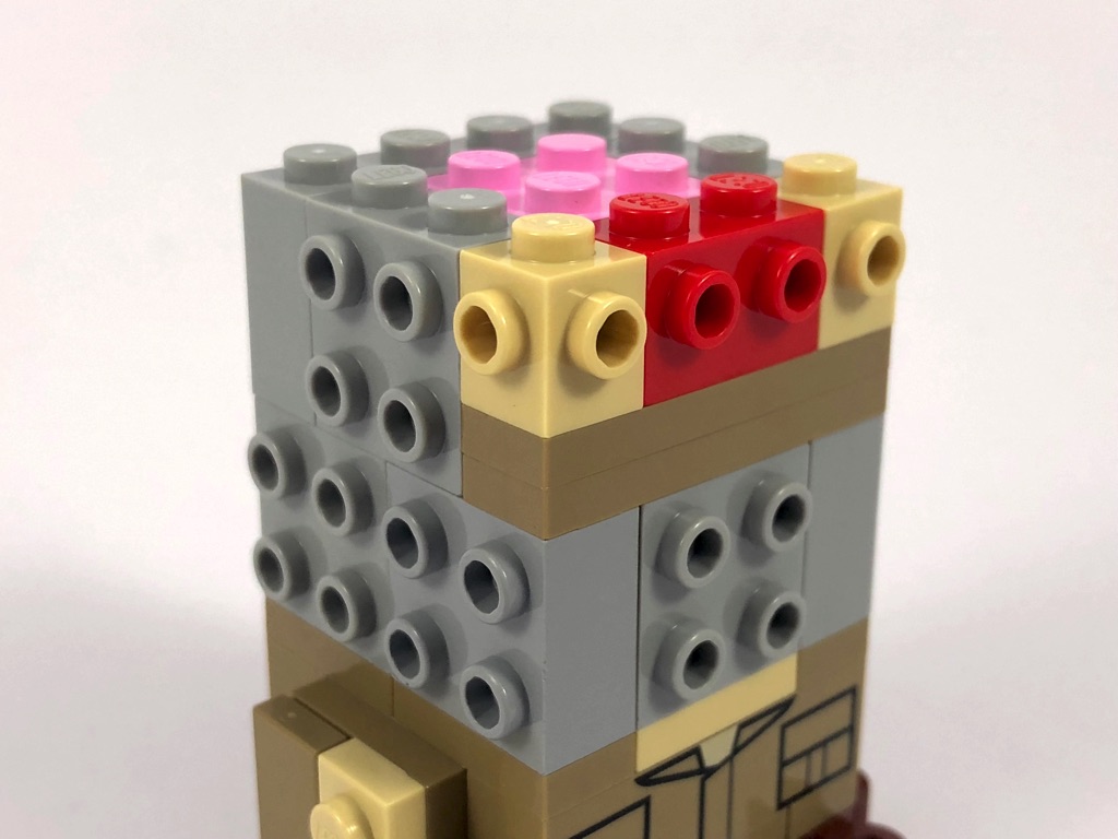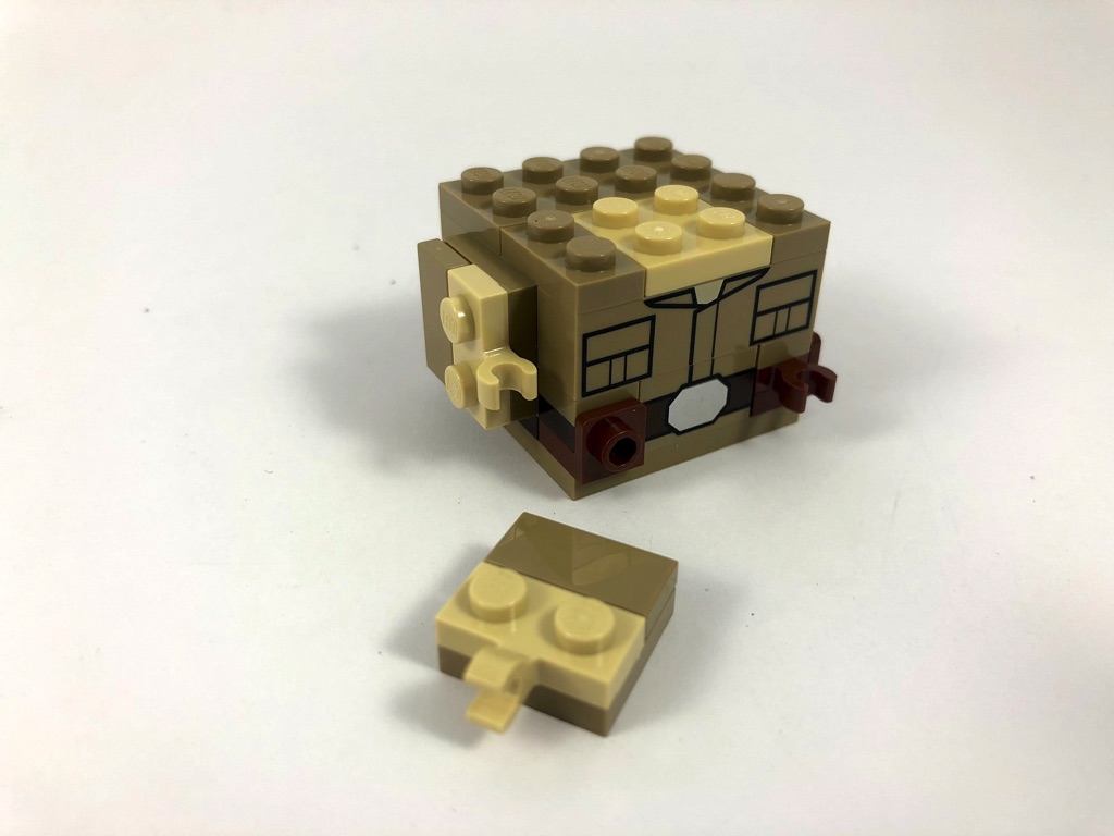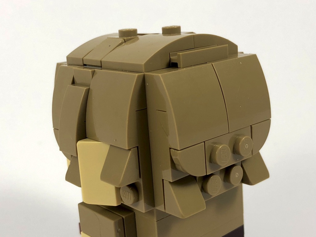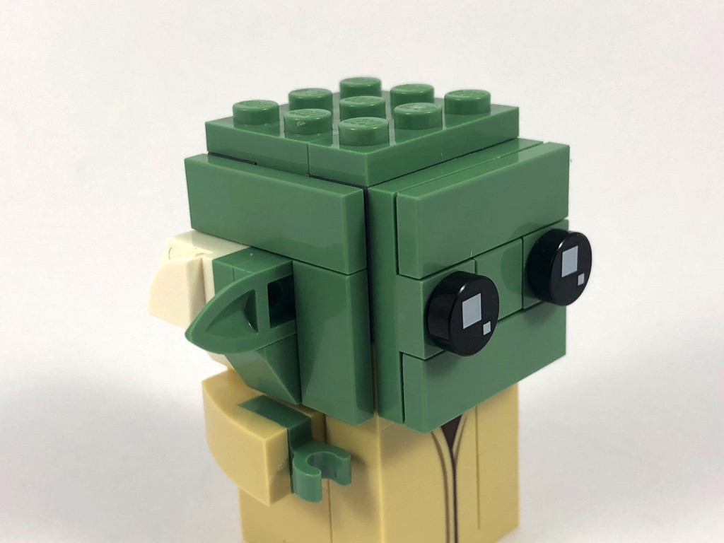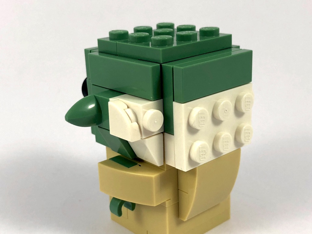 Nous commençons par Yoda, dont la construction est assez classique si ce n’est qu’il s’agit d’une « petite » BrickHeadz (base de 3×3 tenons, contre 4×4 habituellement). Nous construisons d’abord le torse, avant la tête où l’on retrouve le cerveau rose habituel, puis l’on habille les 5 faces de celle-ci. On notera une technique intéressante pour la construction des oreilles, basées sur deux « dents » vertes (Plate, Modified 1 x 1 with Tooth Horizontal) dont on voit la face inférieure. La construction se termine en construisant le socle d’exposition de 6×6 tenons qui semble pour le coup bien grand, puis en donnant à Yoda son bâton.