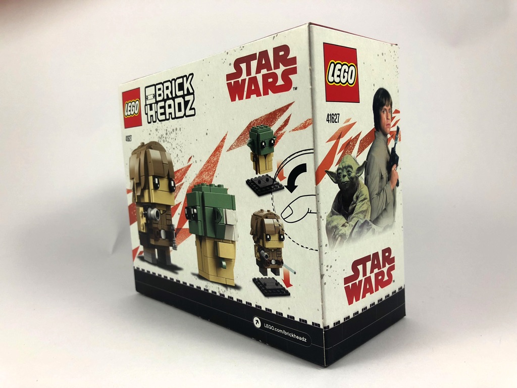 La boîte est d’un format identiques aux autres sets de la gamme composés d’une grande et d’une petite BrickHeadz. Nos personnages sont présentés sur l’avant, vus de face, Luke Skywalker portant le numéro 70 et Yoda le 71. Sur le côté, nous trouvons une photo des personnages vus dans les films, et au dos de la boîte les BrickHeadz se font face. Elles ne sont pas présentées en compagnie des autres sets issus de l’univers Star Wars, comme on le trouve d’habitude.