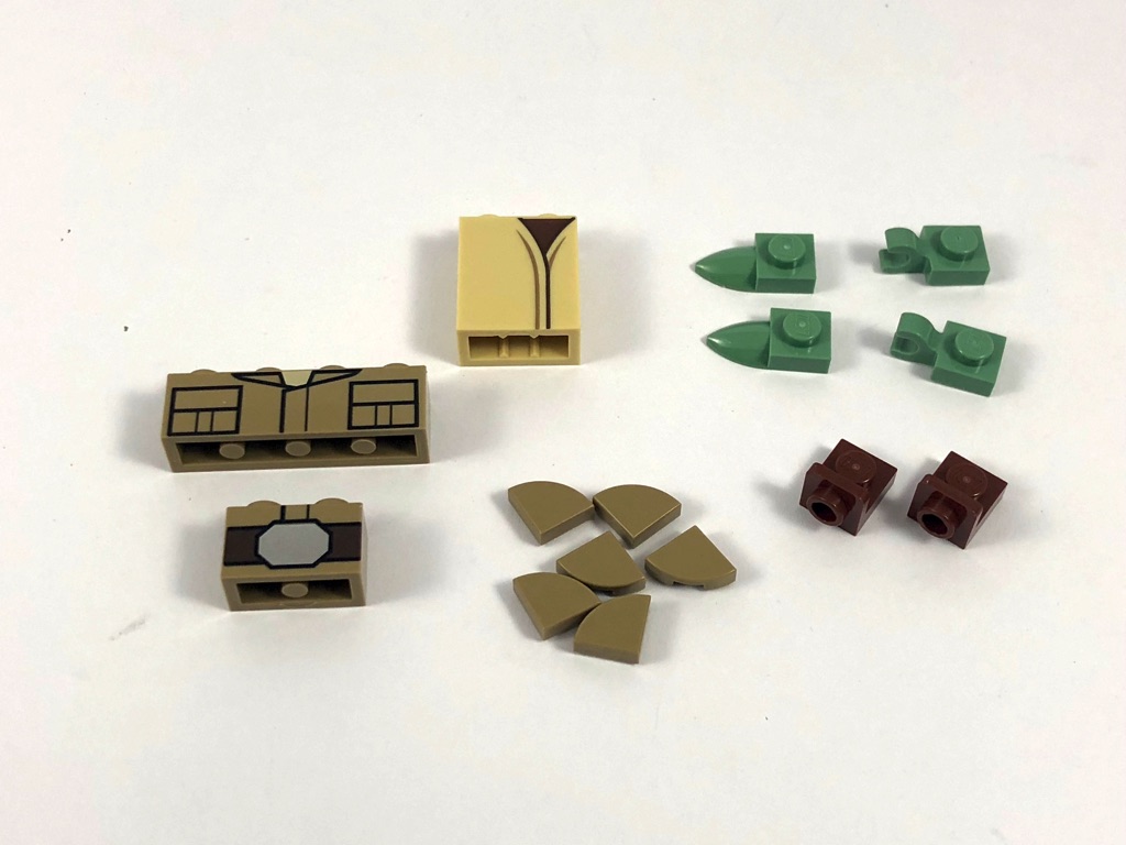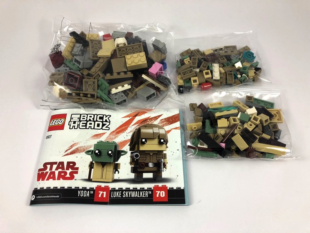 À l’intérieur, nous trouvons trois sachets de pièces non numérotés, et une notice d’instructions de 64 pages pliée en deux. Quelques pièces rares au programme, dont 3 pièces tampographiées pour la robe de Yoda et la veste de Luke, 2 brackets en reddish brown, deux « dents » et deux clips pour les mains de Yoda en sand green, et quelques tiles en quart de cercle en dark tan.