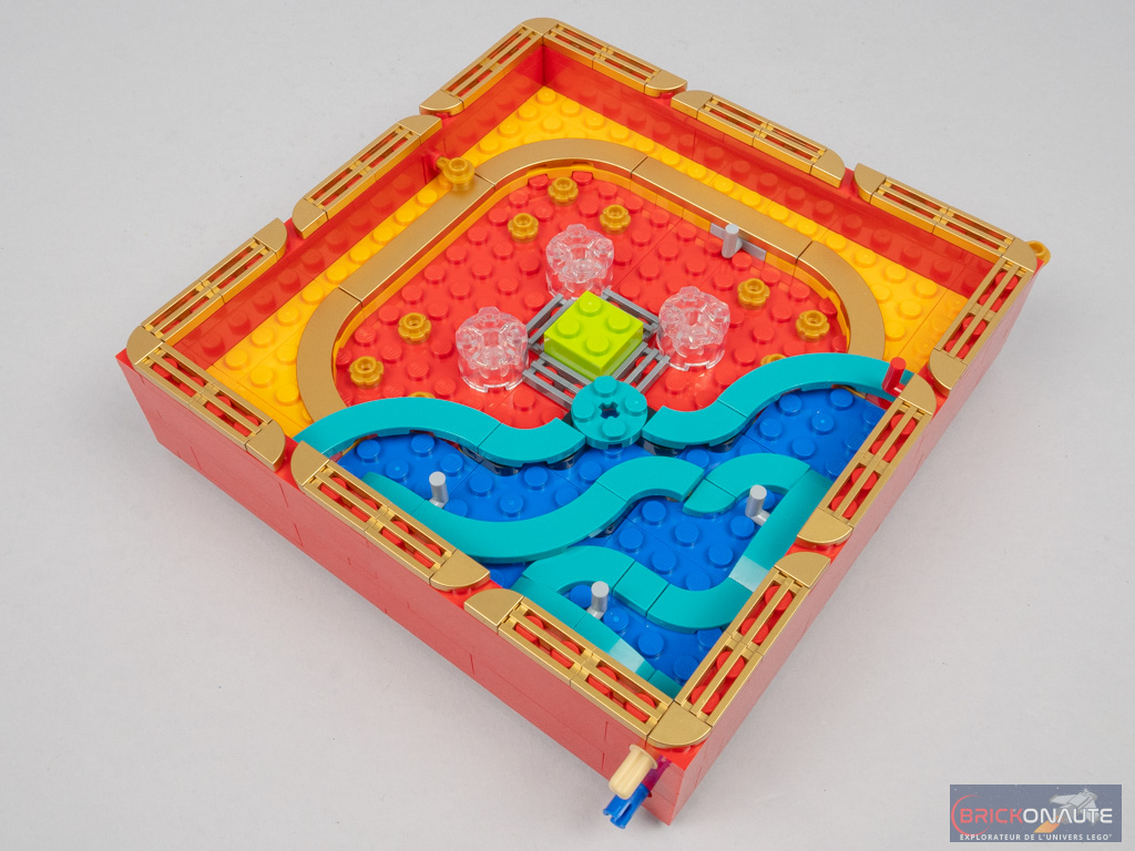 d’être en pleine éclosion » et nous propose une très jolie pivoine à la conception ingénieuse, deux autres pivoines plus petites, et de nombreuses petites fleurs jaunes de pivoine arbustive. On y trouve également deux papillons – désormais disponibles également dans le set LEGO Ideas 21338 A-Frame Cabin (2082 pièces, 179,99€). Le fond est en « négatif » par rapport à la décoration précédente avec un centre orange et un fond rouge, et les grandes tiles rondes portant les caractères chinois sont disposées différemment. La forme de la « ceinture » dorée est également plus travaillée.