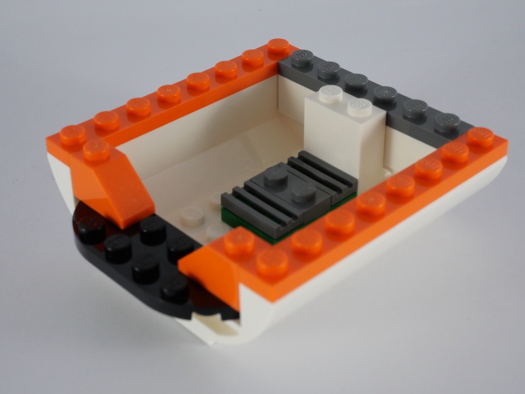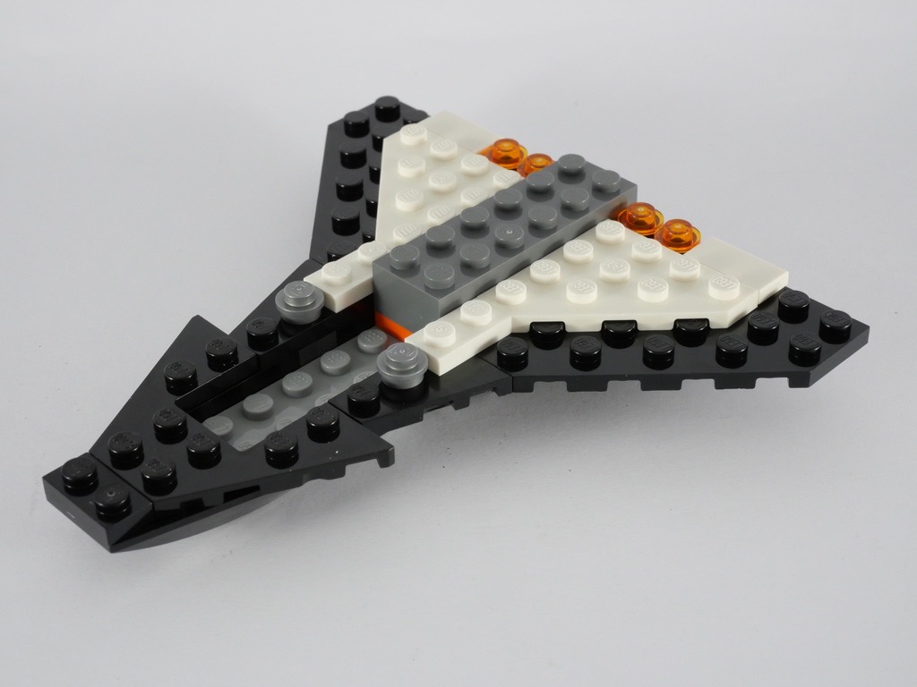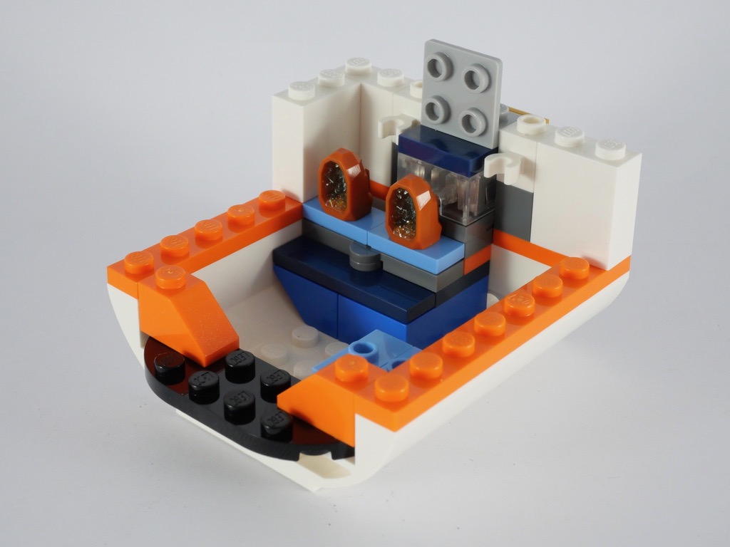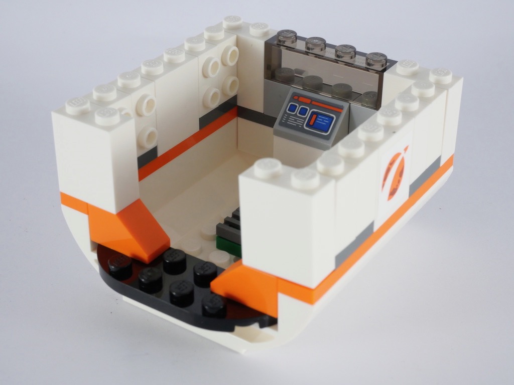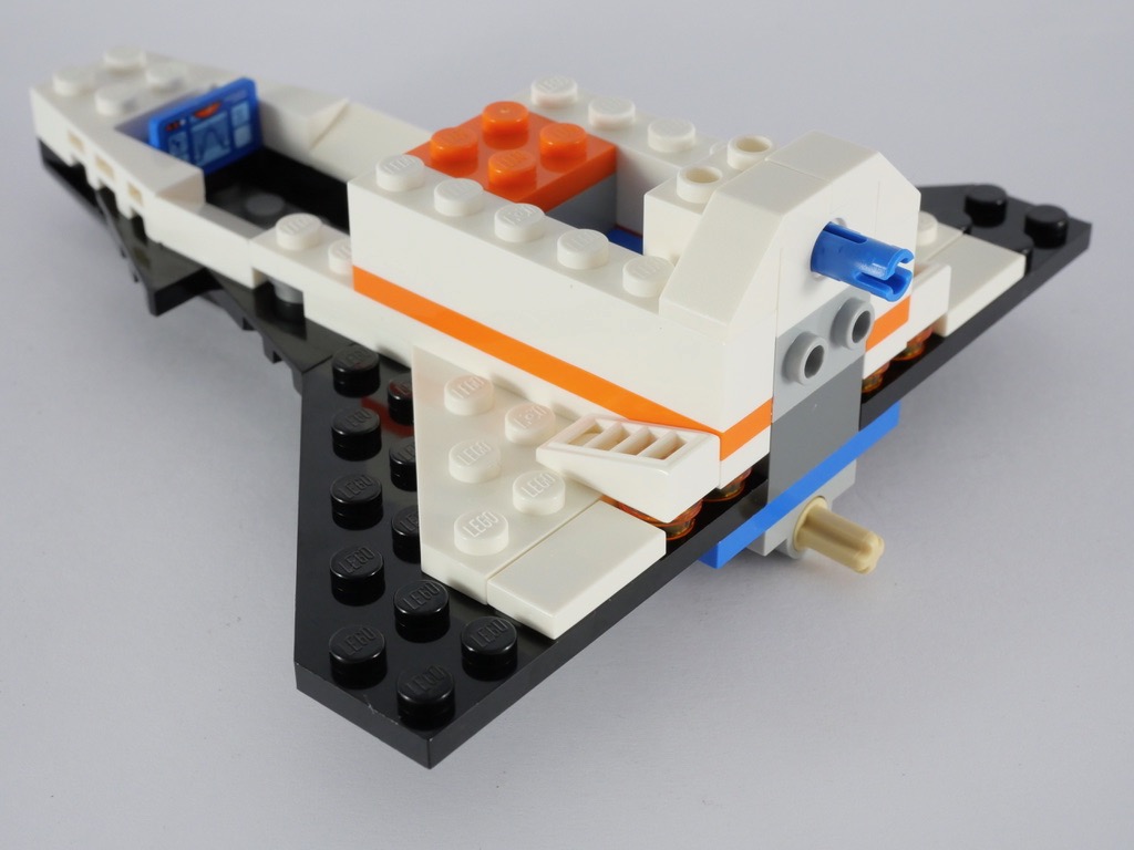 La construction commence par le mini-robot spatial, composé de 7 pièces, avec sa tile tampographiée pour les yeux. On passe alors à la navette. La construction est assez simple et se limite à une superposition de briques et plates. Des briques en trans orange font office de réacteurs, tandis que la forme des ailes est reproduite grâce à des plates biseautées. Le poste de commande se réduit à un panel bleu orné d’un autocollant. La forme particulière de la partie supérieure est obtenue avec quelques slopes blanches. On termine la construction avec la verrière monobloc clipsée au reste : on peut ouvrir le cockpit pour y installer une minifig. On notera cependant que, vue la faible hauteur disponible sous la verrière, on ne pourra installer la minifig qu’allongée. Deux pins situés à l’arrière de la navette permettront de la fixer au reste de la station.