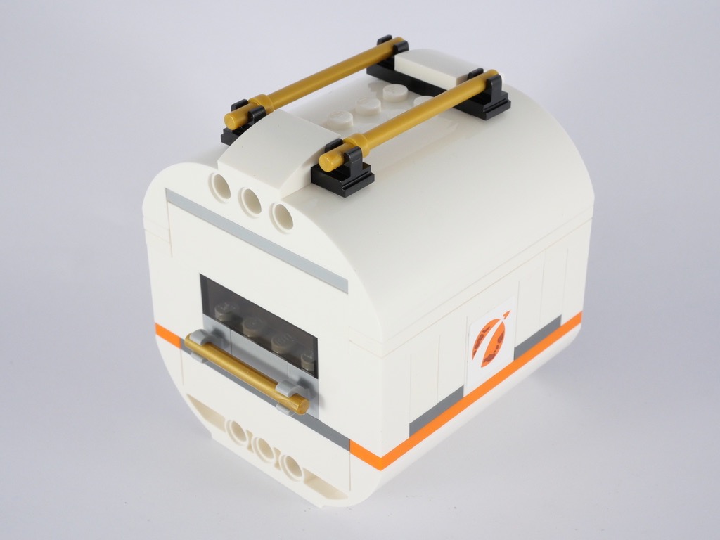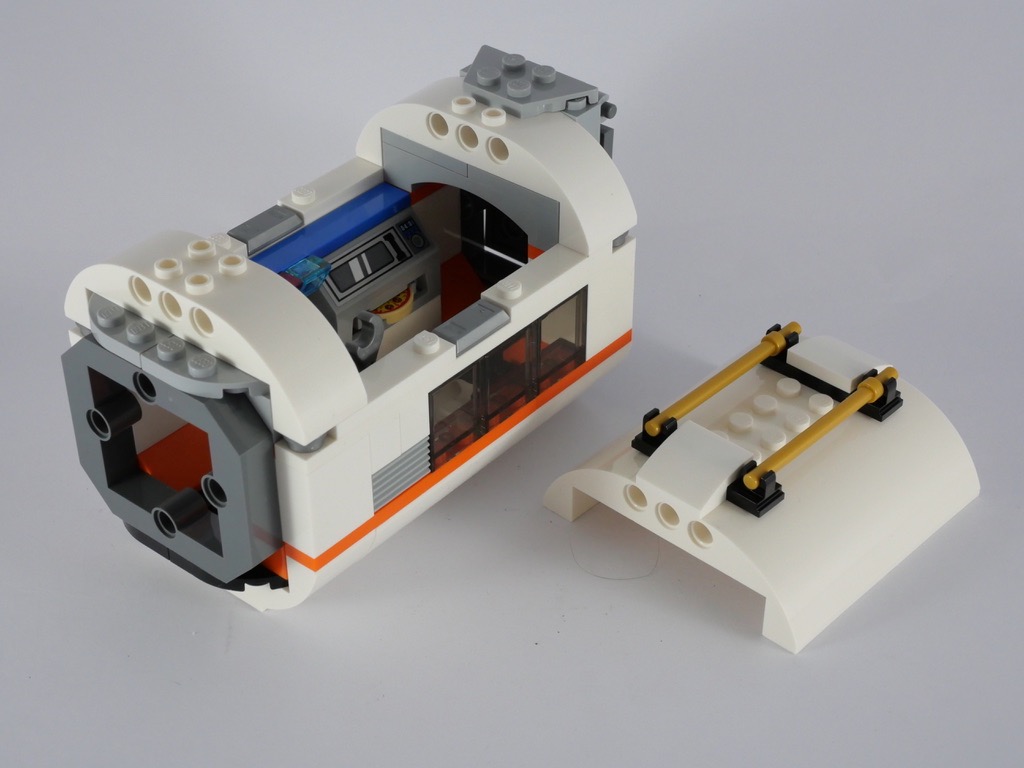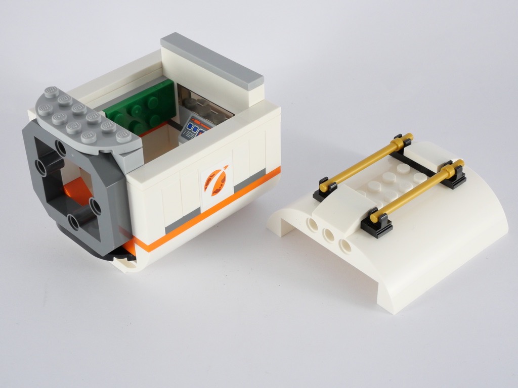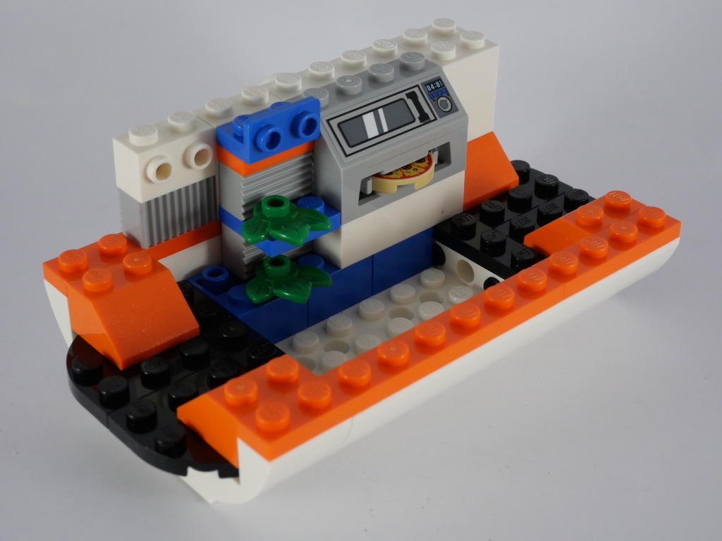 On passe ensuite à la station proprement dite, et plus particulièrement au premier module. C’est d’ailleurs le plus grand de tous. La base est constituée par un Bow Bottom 8X8X2 Ø4.85 blanc, allongé de part et d’autre de 2 tenons par un Bow Bottom 2X8X2 Ø4.85. Une rangée de plates oranges ajoute un liseré de couleur. On aménage ensuite l’intérieur avec, notamment, un four à pizza. Un axe Technic actionné depuis l’extérieur permet d’en faire sortir une. Quelques plantes et slopes translucides colorées complètent le tout. Une rangée de fenêtres est construite du côté opposé, ainsi que quelques outils. On ajoute un cadre gris à chaque extrémité, avant de fermer le tout : une porte côté extérieur, et un sous-assemblage facilement détachable pour accéder à l’intérieur.