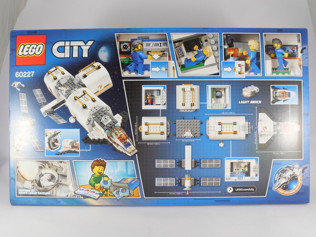 Sur l’avant de la boîte, la station spatiale flotte dans l’espace, avec une navette, un astronaute et un robot à ses côtés. Une petite photo dans le coin inférieur gauche nous indique que le set est inspiré de la Lunar Gateway de la NASA, un station dont le lancement du premier module est prévu pour 2022 et qui orbitera autour de la Lune. En bas à droite, on apprend qu’une brique lumineuse est incluse dans la boîte, ainsi qu’un Rock Crystal translucide. Au dos, la station est décomposée en différents modules, avec les dimensions de chacun. On découvre également quelques détails intérieurs dont… un four à pizza.