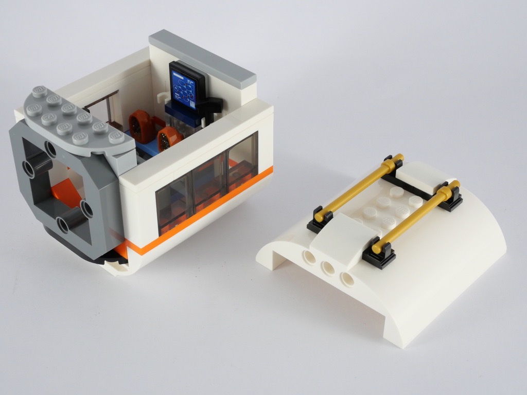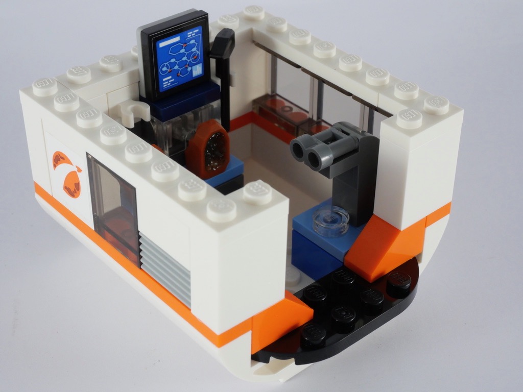 Le second abrite une expérience : la nouvelle pièce Rock Crystal, No. 1002 est illuminée à l’aide d’une brique lumineuse. L’effet est sympa, au travers des « minéraux » situés à l’intérieur de la roche. On trouve ces nouvelles pièces dans l’ensemble de la « sous-gamme » LEGO City sortie ce 1er Juin et consacrée à l’exploration spatiale. On trouve également un microscope, quelques outils et un écran de contrôle dans ce second module. Le toit de chacun d’eux est également amovible, pour facilement accéder à l’intérieur.