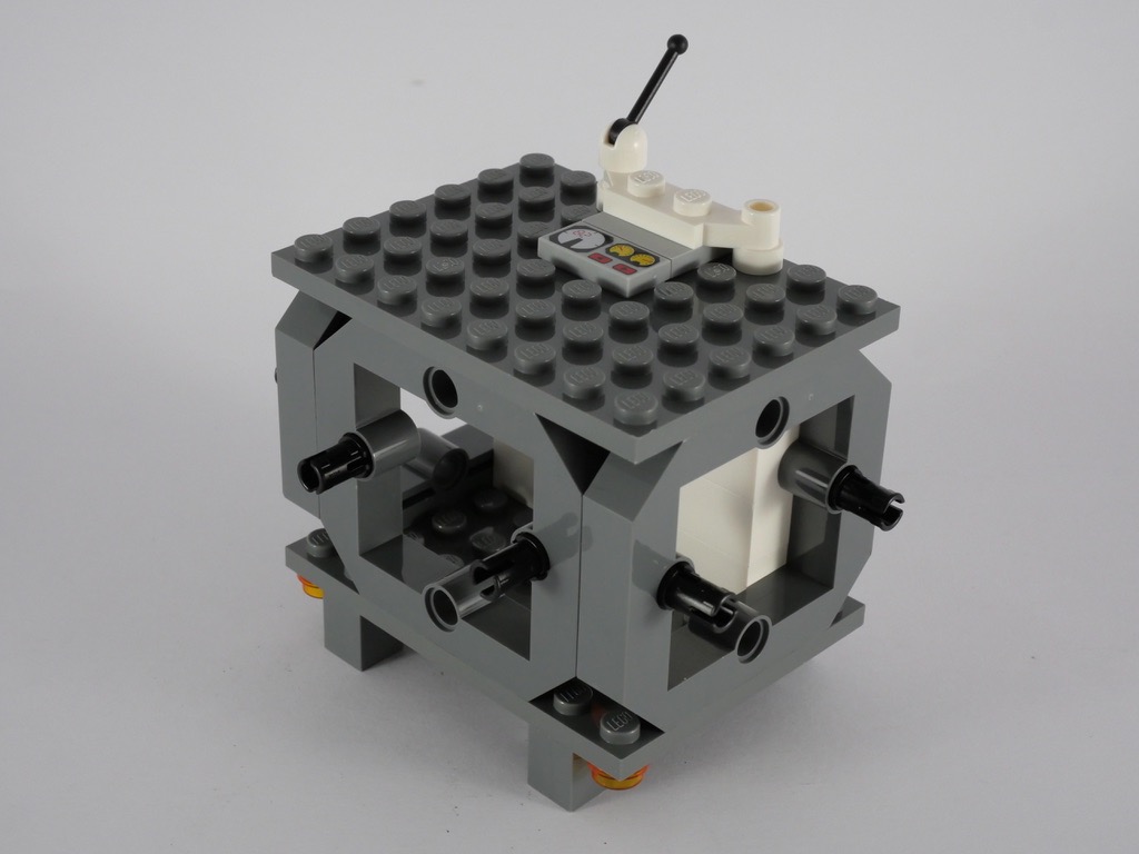Le 4ème et dernier module est un peu différent. On y retrouve un cadre gris sur 3 de ses faces. C’est en effet le module « central » auquel seront attachés tous les autres. Il manque alors de quoi alimenter la station en énergie. On construit un dernier sous-assemblage qui dispose d’une parabole, et de 4 grands panneaux solaires. Ces derniers sont en fait de grands drapeaux couleur dark blue, décorés d’un autocollant, sur une seule face. Ne reste qu’à rassembler les différents modules, et à « sécuriser » l’assemblage avec quelques slopes.
