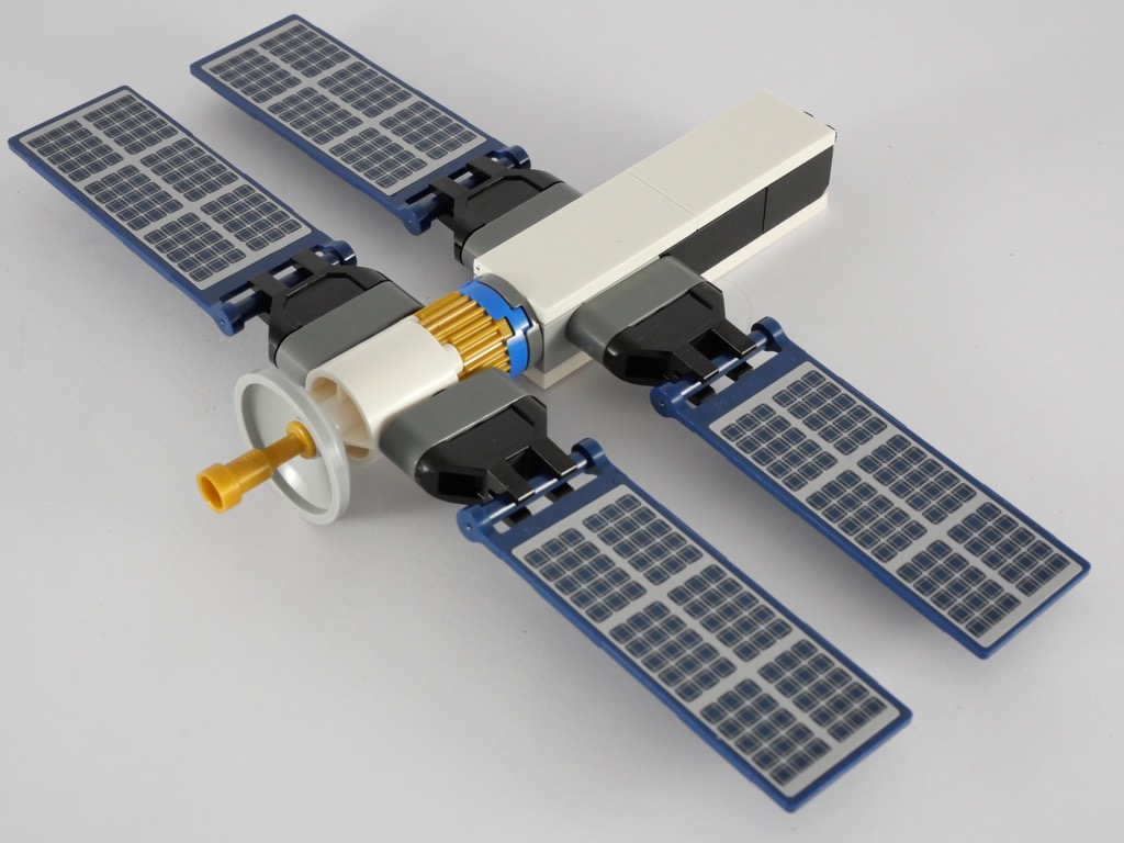 Le 4ème et dernier module est un peu différent. On y retrouve un cadre gris sur 3 de ses faces. C’est en effet le module « central » auquel seront attachés tous les autres. Il manque alors de quoi alimenter la station en énergie. On construit un dernier sous-assemblage qui dispose d’une parabole, et de 4 grands panneaux solaires. Ces derniers sont en fait de grands drapeaux couleur dark blue, décorés d’un autocollant, sur une seule face. Ne reste qu’à rassembler les différents modules, et à « sécuriser » l’assemblage avec quelques slopes.