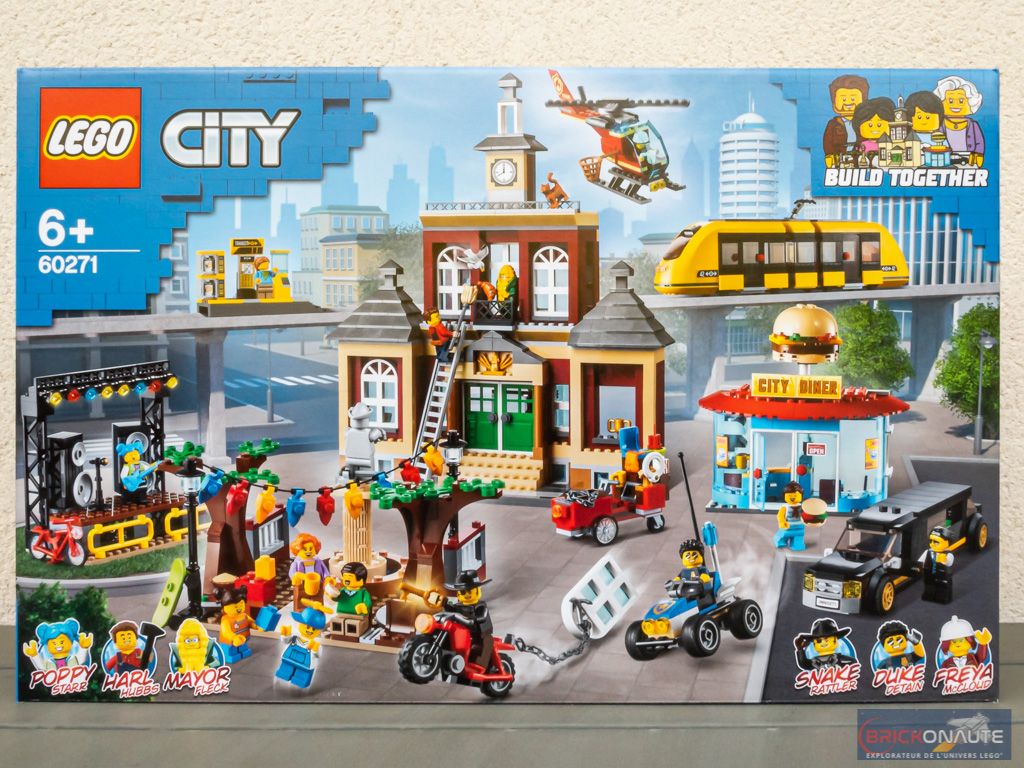 Avec ses 1517 pièces, la boîte est très imposante pour un set de la gamme LEGO City. Sur la face avant de celle-ci, les différents éléments qui composent le set sont mis en scène : Poppy Starr se livre à un concert sur la scène, les habitants partagent du bon temps sur la place, Harl Hubbs est en train de mettre un coup de propre à la mairie et Snake Rattler, à moto, se fait poursuivre par le policier Duke DeTain. Les personnages « connus » nous sont présentés en partie basse, tandis qu’en haut on retrouve la mention Build Together : la boîte est en effet prévue pour partager l’expérience de construction à plusieurs – via les nombreuses notices fournies ou les « Instructions Plus » téléchargeables sur tablette et mobile.