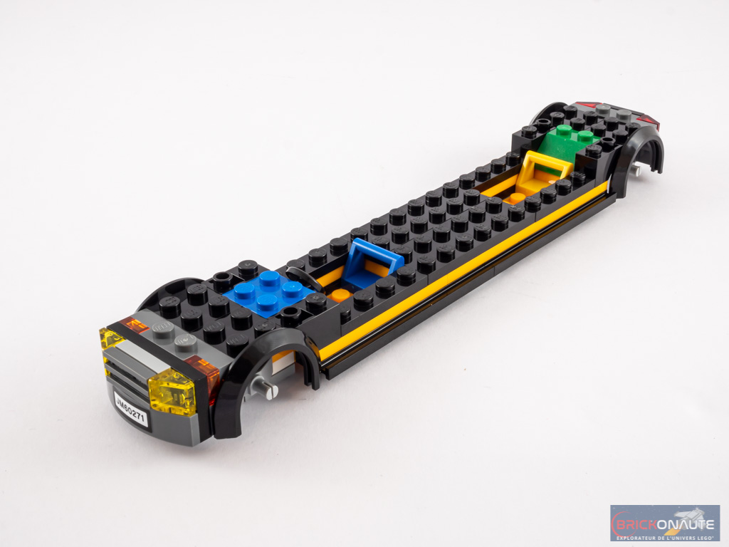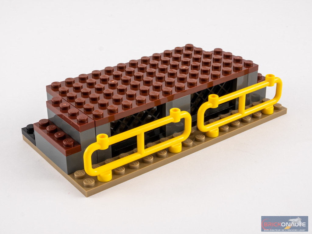 Nous attaquons avec le tram l’un des deux éléments principaux du set. Remarquez ici l’utilisation de deux pièces inédites : l’avant arrondi du tram, et le nez de la machine. Sur cet avant arrondi, la base du tram est constituée par deux grandes plates de 2×16 tenons. On y ajoute deux essieux, puis une base pour recevoir l’intérieur. Celui-ci est constitué de deux sièges à l’arrière, et d’un poste de commande à l’avant. Deux portes battantes (des portes coulissantes auraient sans doute été mieux adaptées) permettent d’accéder à l’intérieur. Au-dessus de surfaces vitrées, des tiles jaunes sont disposées dans le but de recevoir le toit : celui-ci sera facilement détachable. On ajoute le nez de l’engin, et sa verrière articulée sur une charnière, puis le toit. On termine avec le marchepied, les 4 roues et quelques tilesdécoratives sur les côtés.