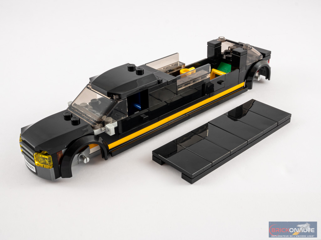 La conception de la limousine est amusante : elle est en fait basée sur deux châssis « standards » de voiture mis bout à bout. On ajoute un essieu à chaque extrémité, ainsi qu’un ensemble basé sur des briques SNOT pour les feux. La voiture, d’une largeur de 4 tenons, ne peut accueillir que deux minifigs. Le chauffeur à l’avant, et le maire à l’arrière. Mais il faudra pour cela lui retirer son costume. L’arrière est sommairement aménagé avec un tasse à café et un écran de télé, et l’avant avec un volant. L’accès à l’intérieur de la voiture est facilité par la conception « modulaire » de celle-ci : le toit se retire facilement.