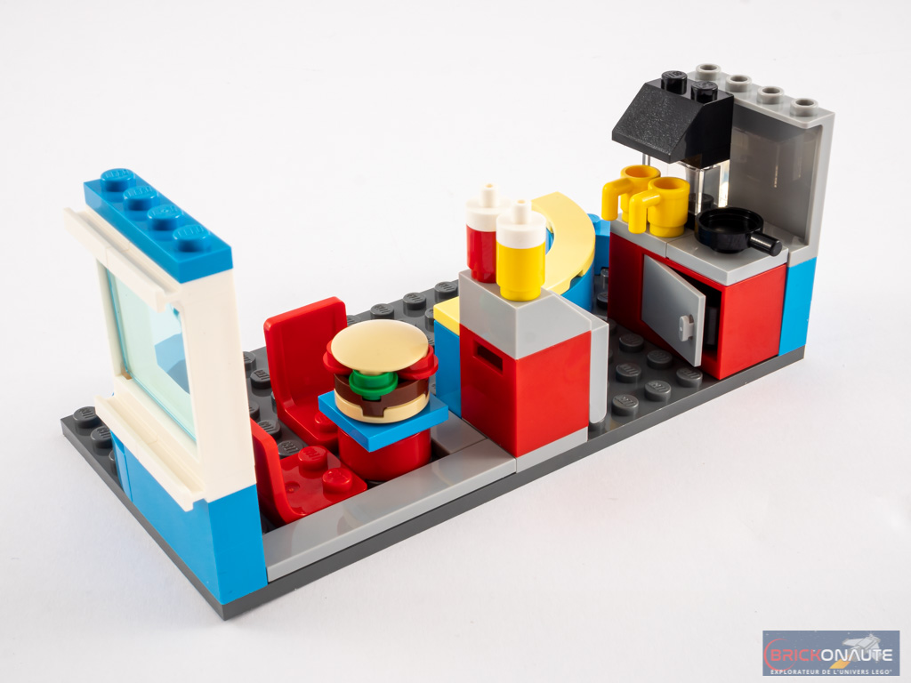 Les minifigs aiment se restaurer, et pour cela elles disposent du « City Diner ». Celui-ci est construit sur une base de 8 x 16 tenons. On commence par aménager l’intérieur avec quelques sièges, un comptoir, une caisse et de quoi cuisiner. On s’occupe alors des murs, consistant pour l’essentiel en 2 grandes vitrines trans light blue. On referme la partie supérieure avec deux grands quarts de cercle rouges. Le nom du restaurant est fixé sur deux tiles, puis nous passons à l’enseigne en forme de hamburger. On remarquera pour celle-ci l’utilisation d’une pièce introduite avec la gamme LEGO Super Mario : une plate arrondie dans les angles d’une double épaisseur et disposant d’encoches en partie inférieure (Plate, 6X6X2/3, Circle, W/ Reduced Knobs).
