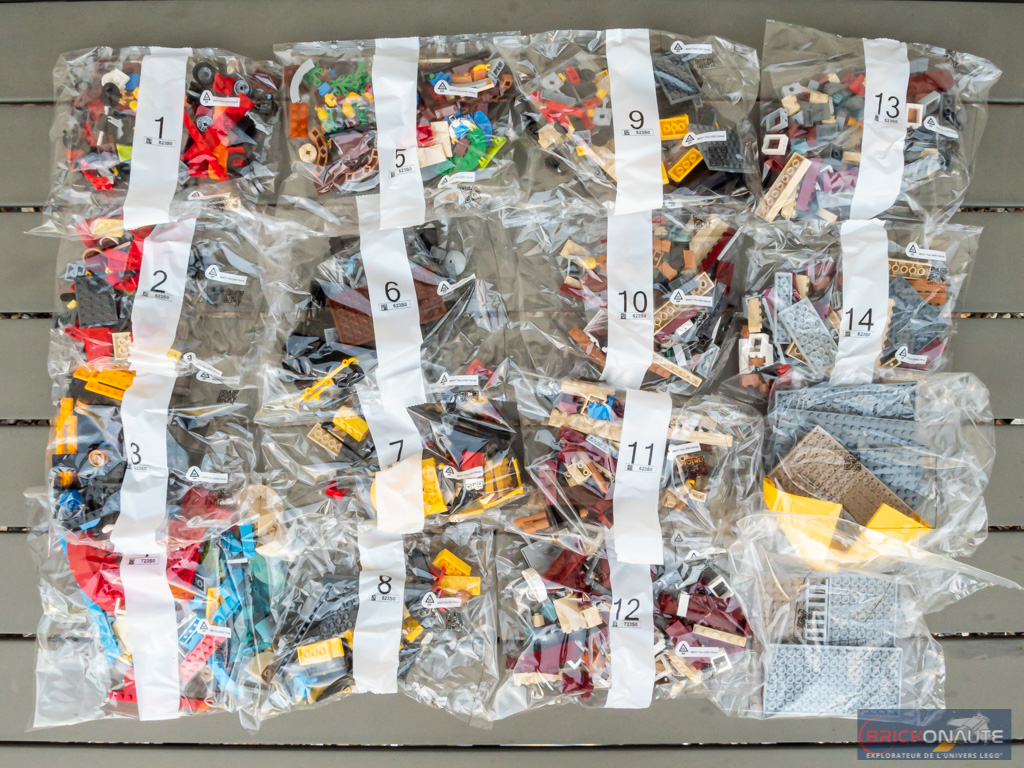 A l’intérieur, nous trouvons 14 sachets de pièces numérotés et 2 autres sans numéro contenant quelques grandes pièces. Nous avons également 8 (!) notices d’instructions, correspondant chacune à un grand, ou plusieurs petits éléments du set. Elles permettront ainsi de partager la construction si on le souhaite. Nous avons également une planche d’autocollants relativement modeste comparativement à la taille du set : 20 au total.
