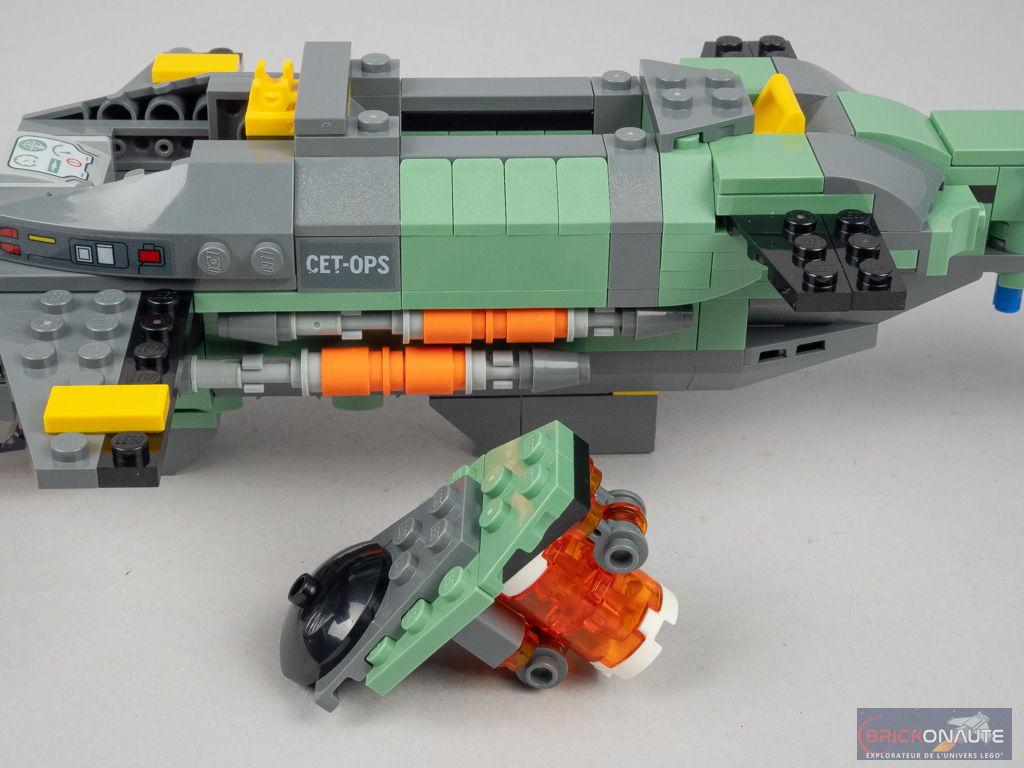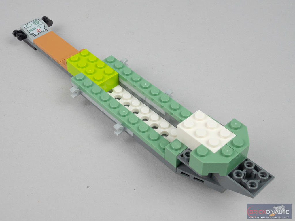On attaque ensuite le sous-marin, basé sur une structure très étroite : 4 tenons seulement. Autant dire qu’on ne pourra pas envisager grand-chose à l’intérieur. Le poste de pilotage du bas est constitué de deux manettes fixées sur des clips, et d’une tile pour pouvoir y allonger une minifig. Dans le second poste de pilotage, la minifig sera assise. Sur les côtés de ce poste, on place des brackets qui reçoivent ensuite l’habillage définitif. On élève les parois à l’arrière, où la structure s’élargit et passe à 6 tenons. Sur les côtés, on vient clipser l’armement – plutôt cohérent avec ce qu’on peut voir dans le film.