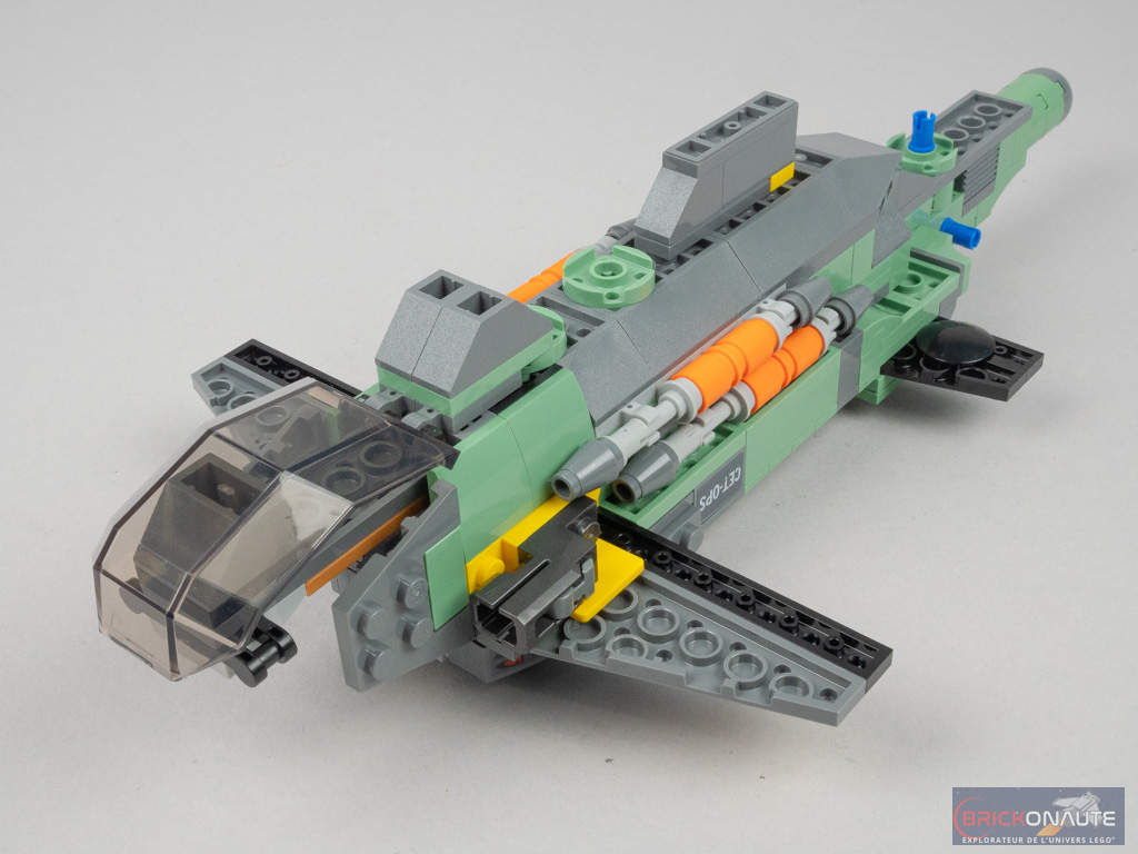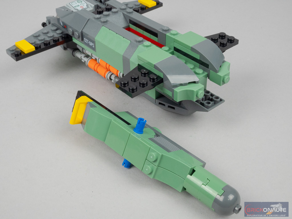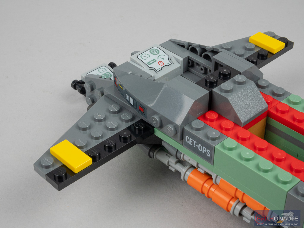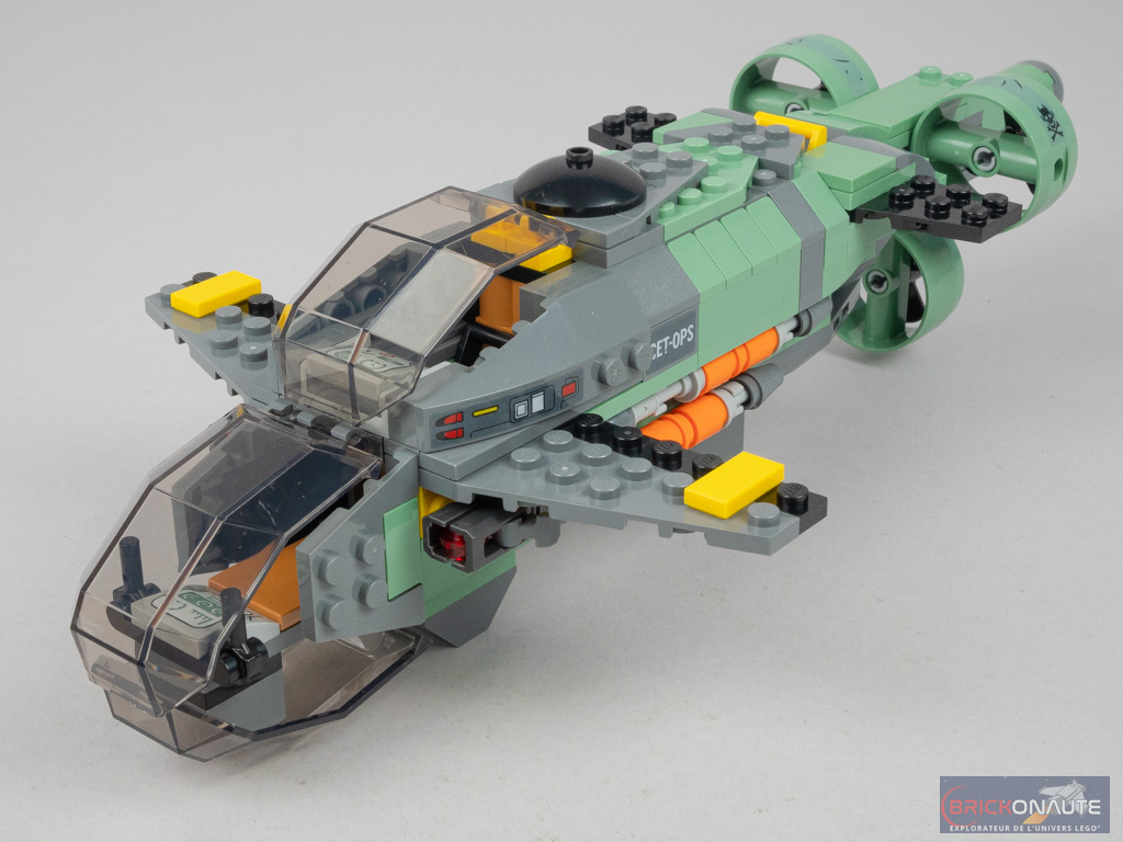On continue en installant deux stud-shooters à l’avant, pour un peu plus de jouabilité, puis deux « ailes ». Des éléments courbes sont fixés sur les côtés du poste de pilotage supérieur, et le raccord n’est pas parfait avec les pièces qui constituent la soute (des slopes plus classiques). Deux « ailes » plus petites sont fixées à l’arrière. On construit alors un grand sous-ensemble qui vient se fixer à l’arrière en guise de « queue », et les 3 hélices sont attachées sur celle-ci à des clips. Remarquez ici les vilains autocollants à appliquer sur ces pièces rondes – ce n’est franchement pas facile. Côté avant, les cockpits sont loin d’être étanches. En partie inférieure, ce sont deux pièces transparentes courbes qui se rejoignent. Cette même pièce est utilisée pour fermer le poste de pilotage supérieur. Un petit sous-ensemble, qu’on imagine être le moteur, vient s’insérer sur le dessus de la machine. Là encore, des photos dans la notice nous permettent de comparer avec le véritable engin… et la comparaison n’est pas flatteuse.