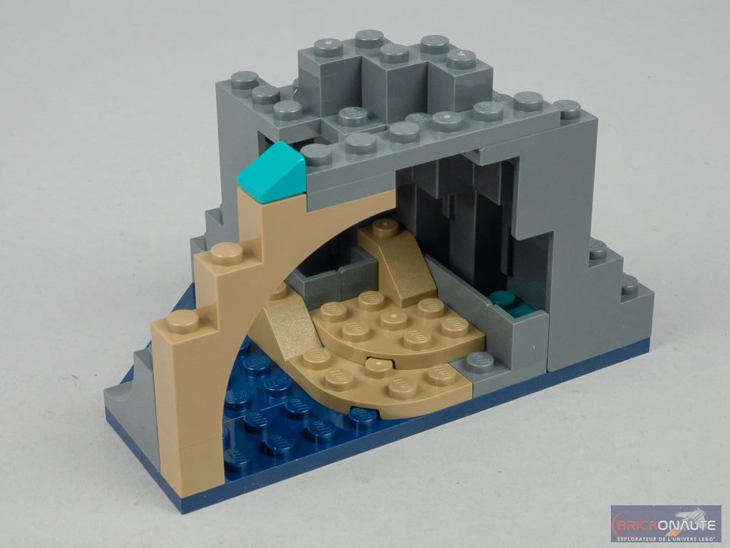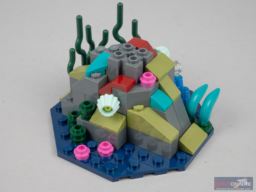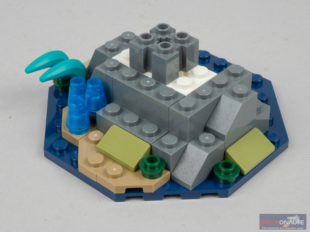 La dernière construction est vite expédiée : il s’agit d’un troisième récif, constitué cette fois-ci de slopes grises et vertes empilées les unes sur les autres. On retrouve le même type de végétation que sur les récifs précédents. En son centre, le massif présente une pièce Technic qui permettra la fixation du sous-marin pour son exposition.