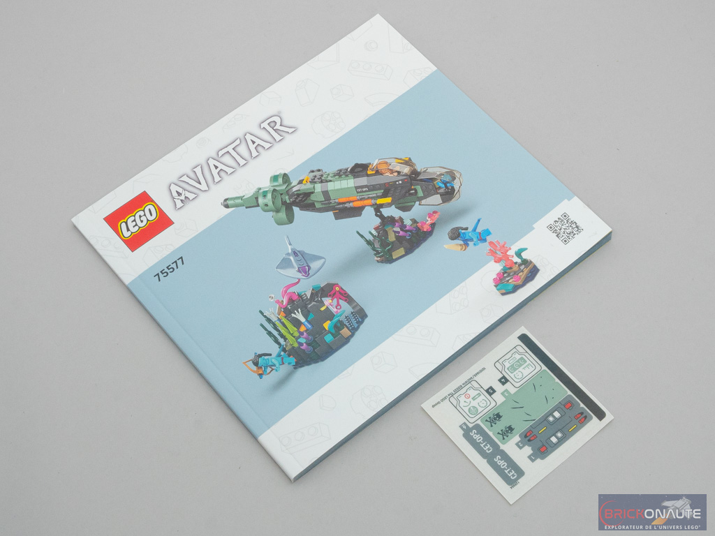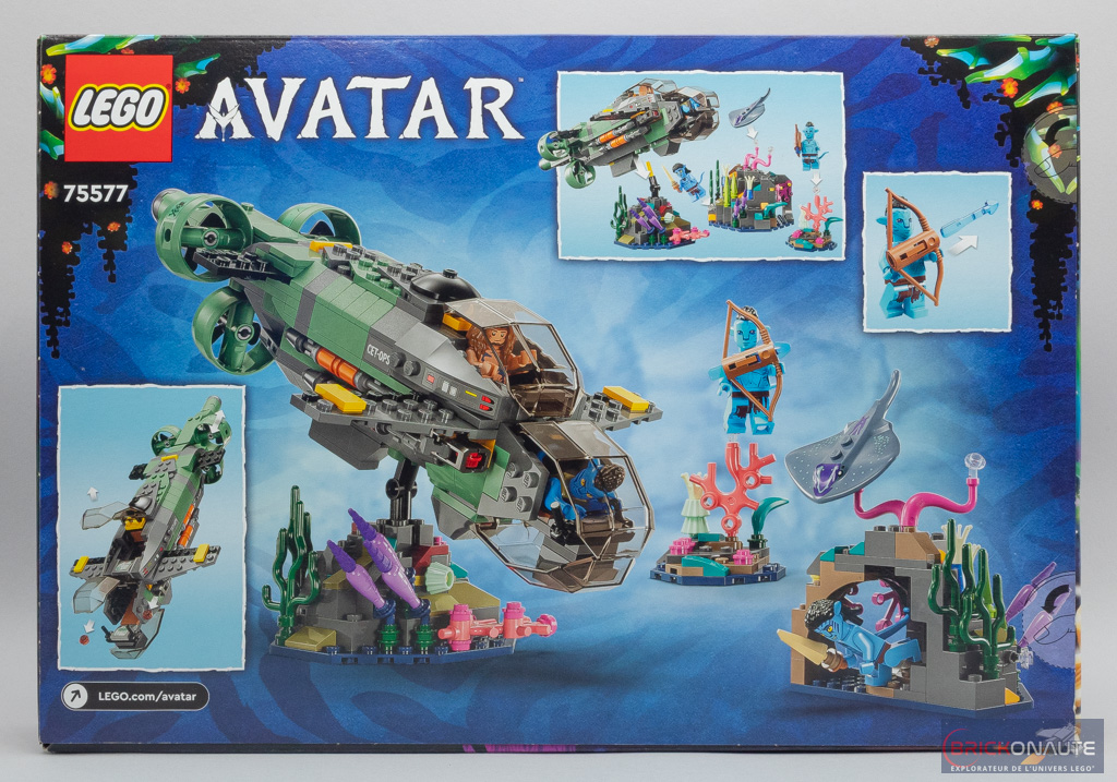 Comme toutes les boîtes de cette gamme, les couleurs sont vraiment jolies. Sur la face avant, Quaritch (en Na’vi) est aux commandes du sous-marin en compagnie de Spider. Neteyam et Ao’Nung, armés respectivement d’une lame et d’un arc, nagent à proximité. Sur le fond sous-marin reposent 3 récifs colorés. Au dos de la boîte, le sous-marin est attaché à son support fixé au récif – Neteyam et Ao’Nung sont attachés aux supports transparents disponibles. Quelques vignettes nous montrent les principales fonctionnalités de l’ensemble.