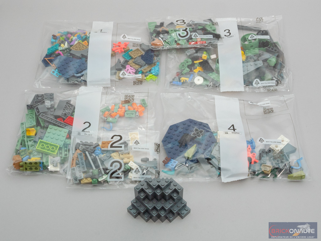 À l’intérieur, nous trouvons 6 sachets numérotés de 1 à 4, et un gros morceau de rocher. La notice d’instructions compte 144 pages, et LEGO fournit également une petite planche de 8 autocollants. Avec 553 pièces pour 54,99 €, l’inventaire semble « honnête ». Une lecture rapide de l’inventaire ne m’a pas permis de déceler d’éléments particulièrement rares, si ce n’est une jolie collection d’éléments couleur sand green dont les trois supports d’hélices, inédits dans cette couleur, l’arc version « stud shooter » (ou arrow shooter ?) d’Ao’Nung, et quelques couleurs sympas pour les éléments de végétation.