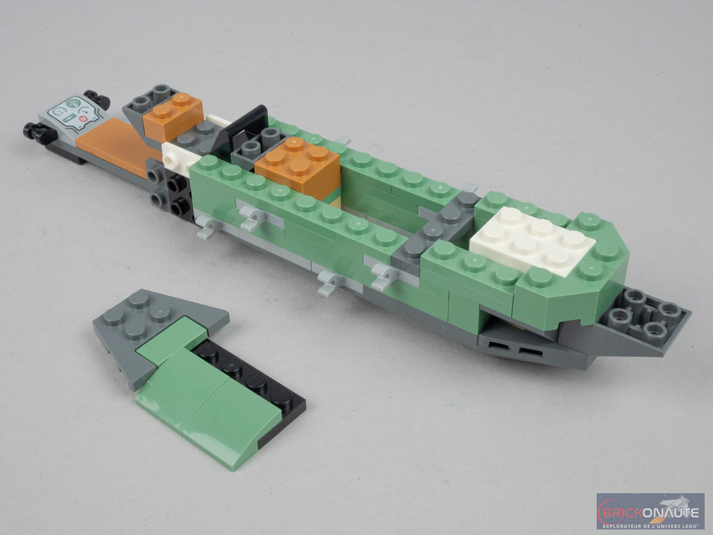 On attaque ensuite le sous-marin, basé sur une structure très étroite : 4 tenons seulement. Autant dire qu’on ne pourra pas envisager grand-chose à l’intérieur. Le poste de pilotage du bas est constitué de deux manettes fixées sur des clips, et d’une tile pour pouvoir y allonger une minifig. Dans le second poste de pilotage, la minifig sera assise. Sur les côtés de ce poste, on place des brackets qui reçoivent ensuite l’habillage définitif. On élève les parois à l’arrière, où la structure s’élargit et passe à 6 tenons. Sur les côtés, on vient clipser l’armement – plutôt cohérent avec ce qu’on peut voir dans le film.