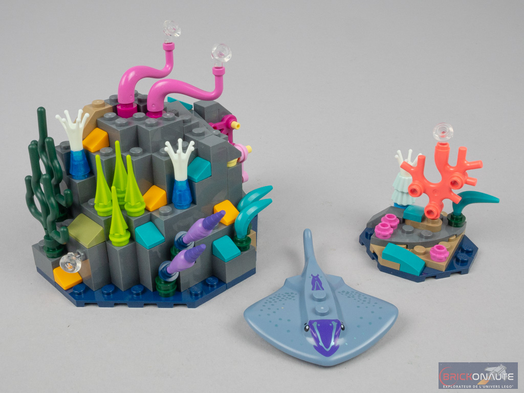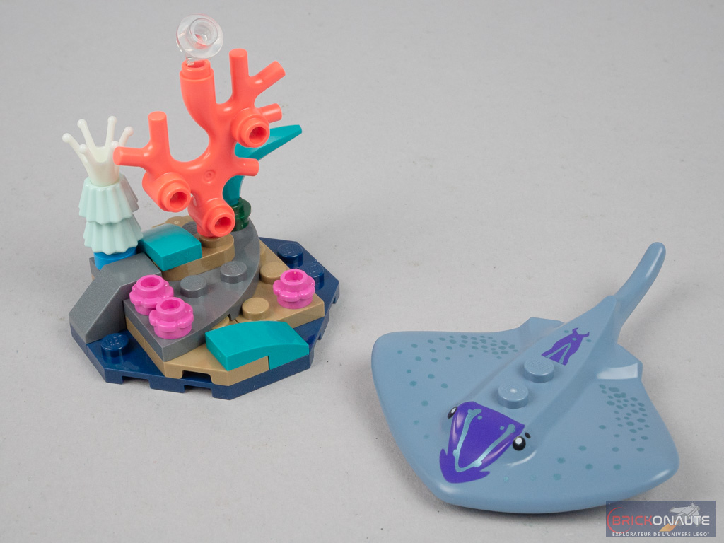 Le designer a pris le soin d’intégrer de nombreux points d’attache pour les minifigs et la jolie raie, grâce à des petits éléments transparents. L’un des récifs dispose également d’un axe Technic en son centre pour y fixer le sous-marin – il peut d’ailleurs être fixé dans les deux sens. C’est plutôt intelligent pour qui voudrait créer une petite mise en scène statique et exposer l’ensemble. C’est moins pertinent pour un jeune qui voudrait simplement s’amuser avec le set.