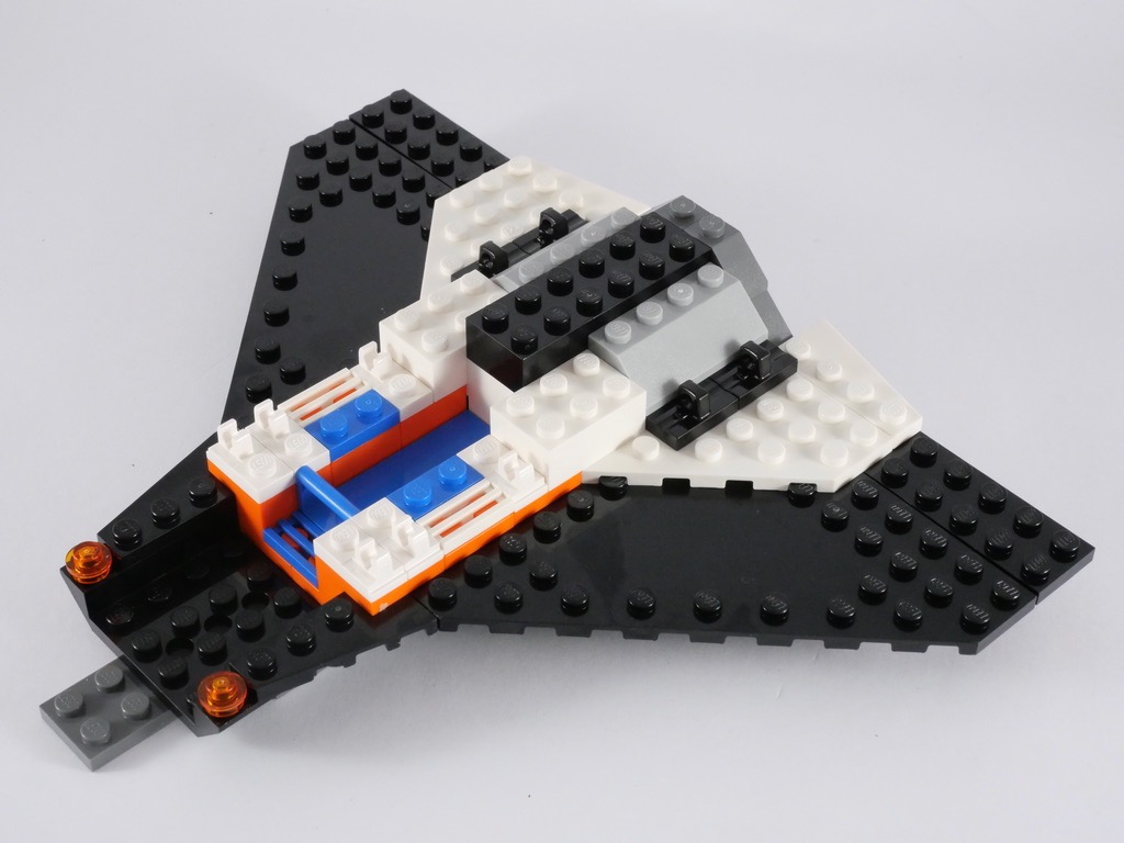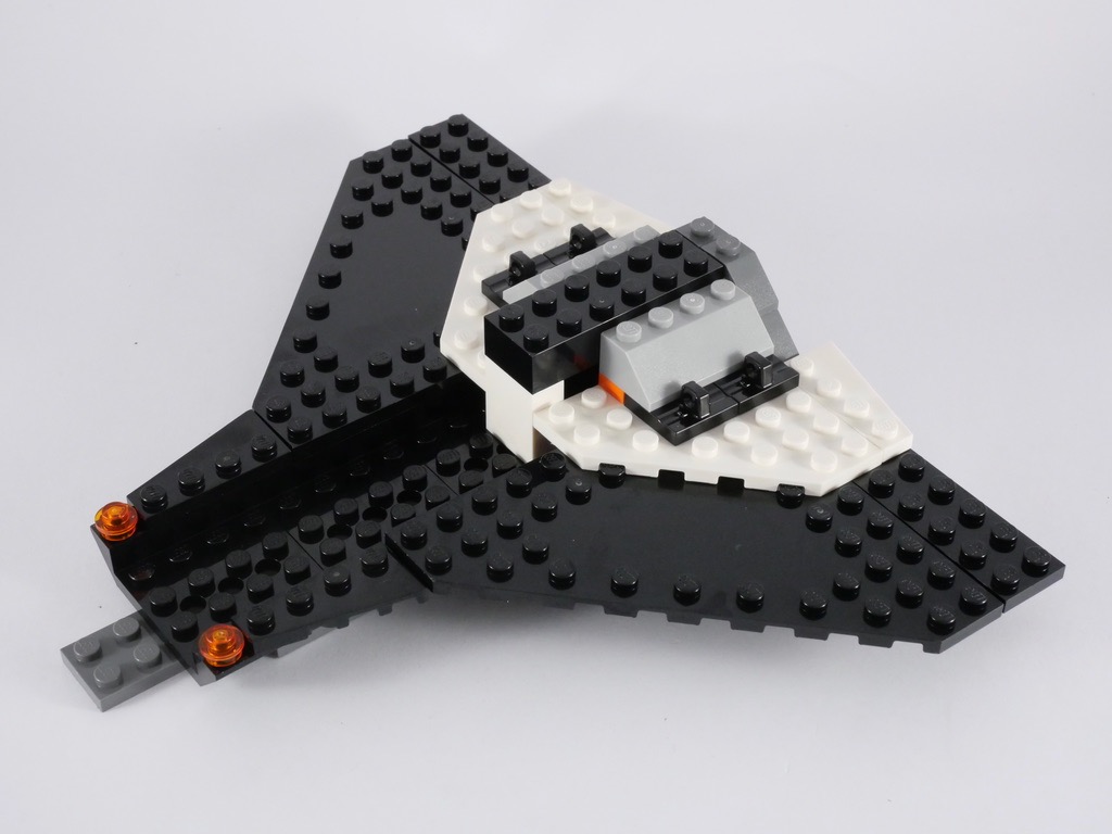 C’est le moment de passer au vif du sujet : la navette. On commence par sa base, constituée de demi-coques noires auxquelles on vient ajouter les ailes. Celles-ci sont constituées d’immenses pièces triangulaires (10 x 10 tenons). Sur cette base, on commence par s’occuper de l’arrière. On y ajoute quelques pièces blanches pour habiller les ailes, et de quoi fixer les réacteurs. On s’occupe ensuite du compartiment intermédiaire, qui dispose de clips sur les côtés pour recevoir les portes. Nous ajoutons le poste de pilotage, une demi-coque de bateau noire, puis nous terminons ce 2ème sachet de pièces avec le réacteur principal.