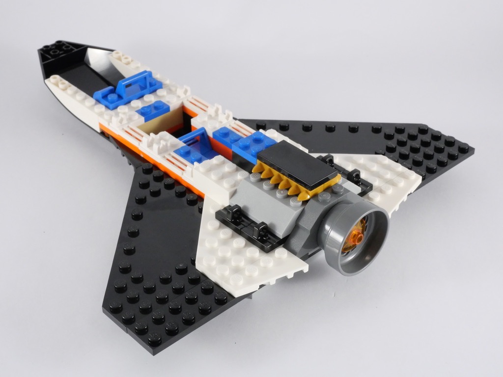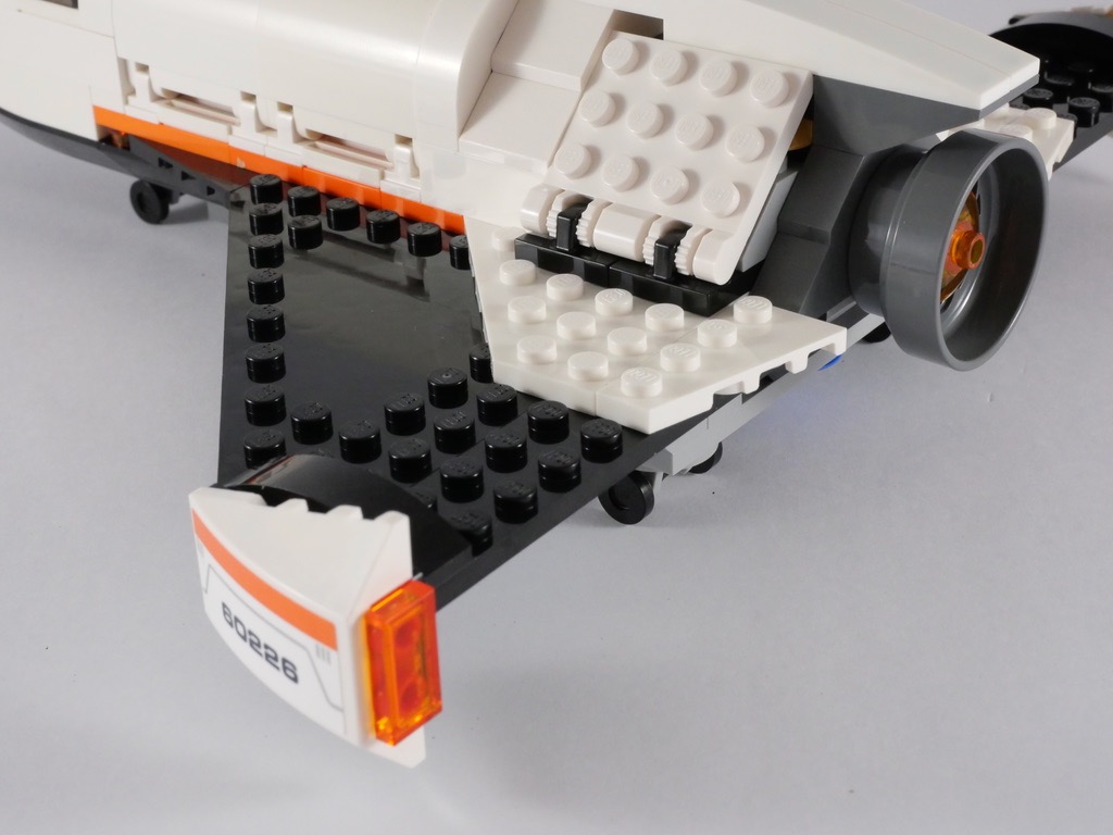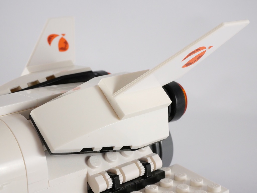 Après avoir ajouté 4 trains d’atterrissage, il ne reste qu’à aménager l’arrière de la navette. Les réacteurs y sont fixés sur deux grandes plates reliées aux ailes à l’aide de charnières pour trouver l’angle idéal. On décore également le bout des ailes. Petite note au passage : les grands autocollants situés sur les « ailerons » ne sont pas spécialement faciles à appliquer. Ceci achève la construction de la navette et donc de notre modèle.