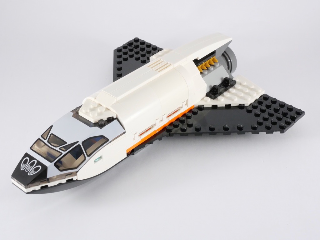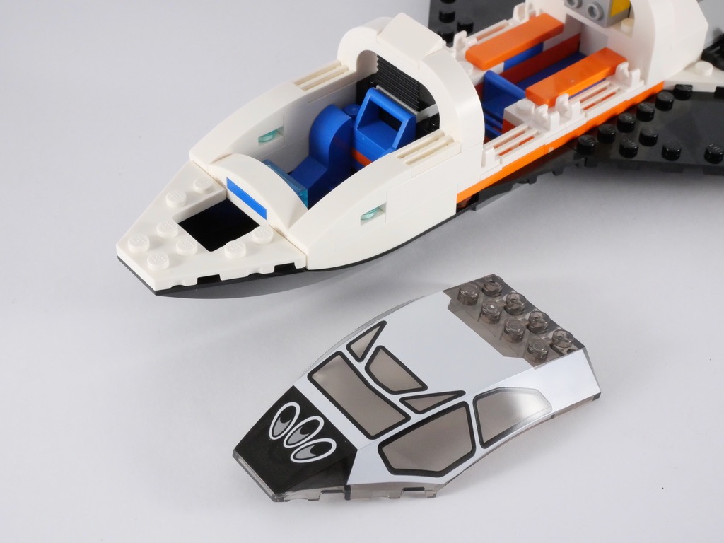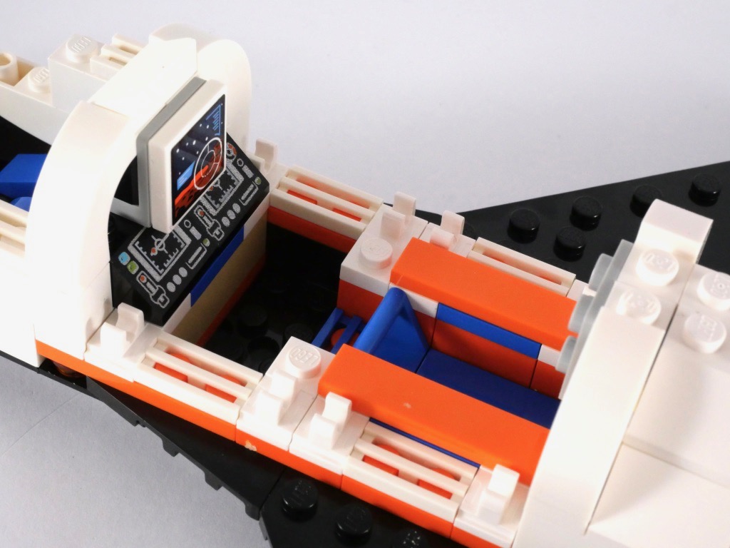 S’agissant avant tout d’un jouet, il va sans dire que l’aspect « jouabilité » est sans doute le plus important pour ce type de set. Et c’est plutot réussi de ce point de vue. Deux espaces intérieurs à la navette permettent d’y placer le pilote et l’astronaute, et il est possible d’ouvrir l’espace cargo. Dommage que la verrière ne soit pas également articulée sur des clips, on est obligé de l’enlever pour mettre le pilote aux commandes.