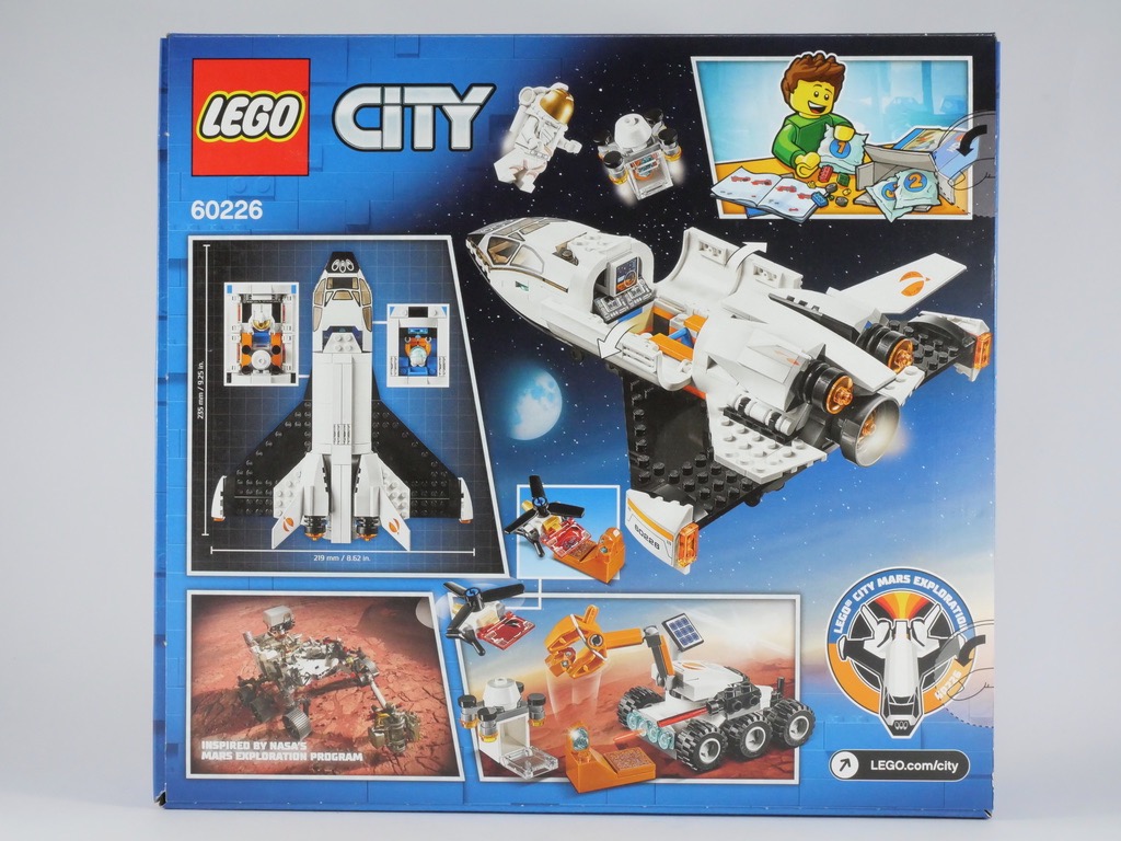 Sur l’avant de la boîte au format carré, la navette spatiale est en vol au-dessus du sol martien tandis que le rover s’affaire au sol pour récupérer des minéraux. Le coin inférieur droit nous indique que ce set est inspiré par le programme de recherche martienne de la NASA. Au dos, la navette est également en vol, et quelques vignettes nous présentent les principales fonctionnalités du modèle, je reviendrai sur celles-ci le moment venu.