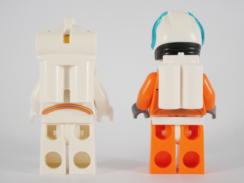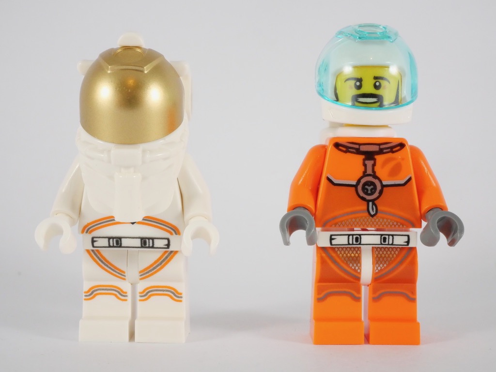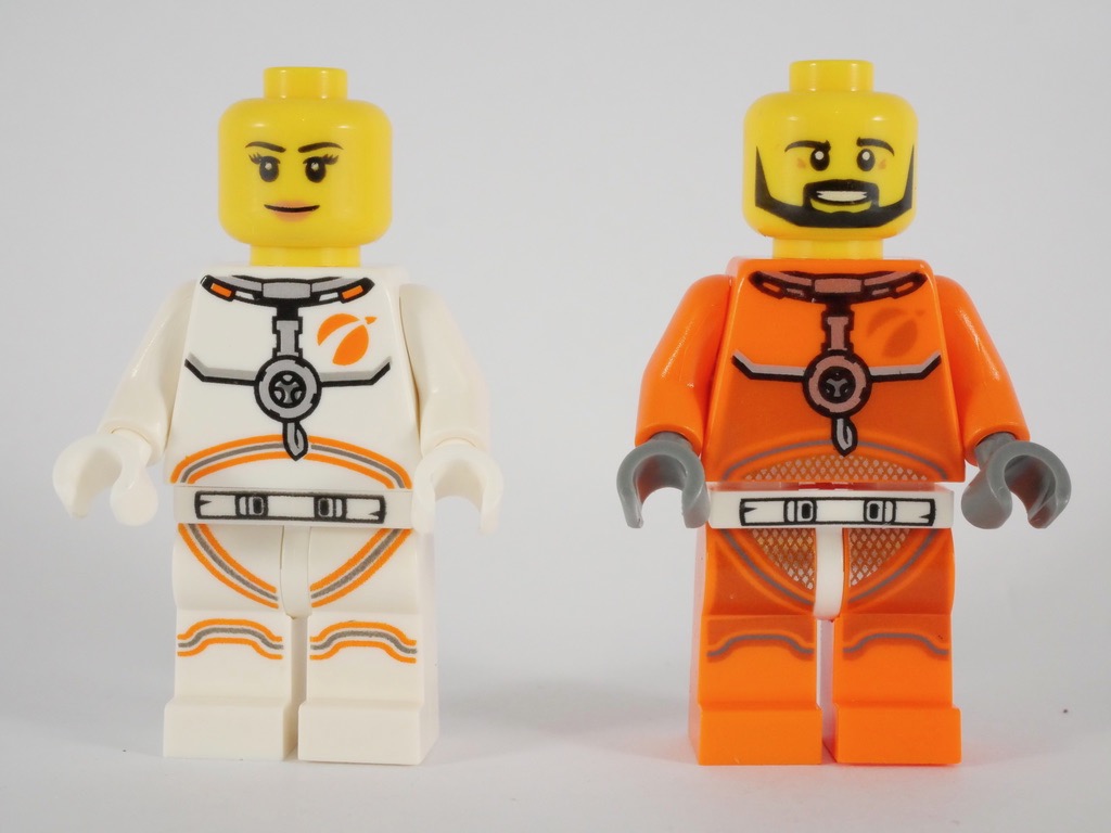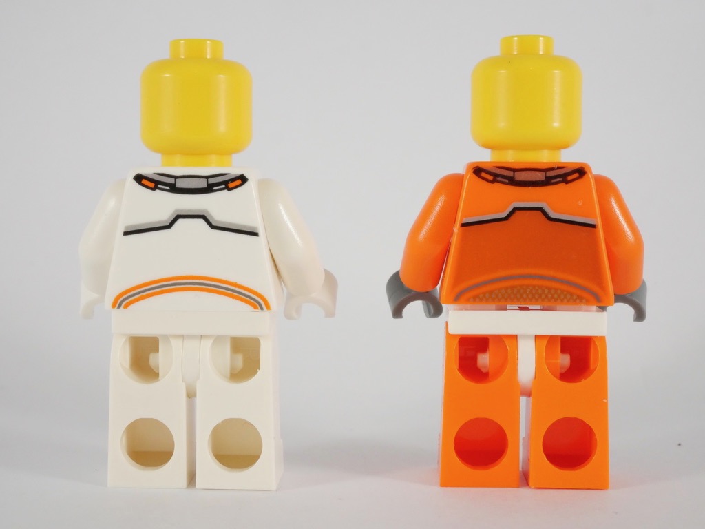 Elles sont deux, et identiques à celles que l’on trouve dans les autres sets de cette série « Espace » de la gamme LEGO City. On en retrouve d’ailleurs le logo sur le torse des personnages. Le premier porte une tenue de pilote orange, tandis que la seconde est vêtue d’une combinaison extra-véhiculaire. Les tenues sont joliment détaillées, qu’il s’agisse du torse ou des jambes. Même s’il est caché par les bouteilles, le dos est également bien réalisé.