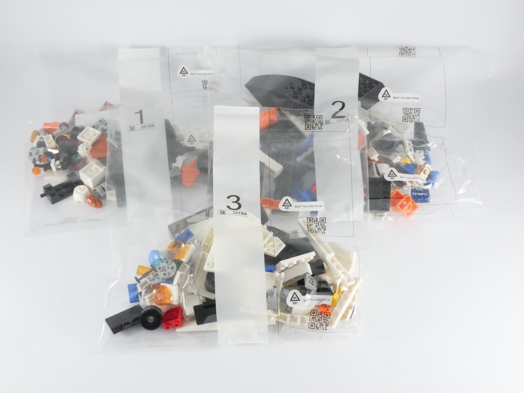 À l’intérieur, ce sont 3 sachets de pièces numérotés qui contiennent les 273 pièces du set. On trouve également 3 (!) notices d’instructions (1 par sachet), et une planche de 10 autocollants.