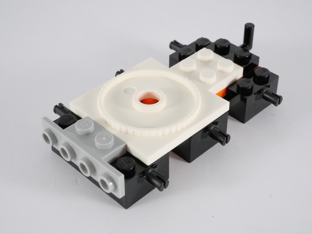 Nous passons alors au rover. Son châssis, d’une largeur de 4 tenons, dispose de 3 essieux. On y ajoute une turntable pour la grue, avant de construire cette dernière. Elle est équipée d’une pince fermant avec un élastique pour attraper les critaux. C’est efficace et robuste. Les différents éléments de la grue sont reliés par des ball joints, celle-ci est donc très mobile. On termine notre rover en lui ajoutant un laser de découpe, et un panneau solaire. Ceci achève le premier sachet de pièces.