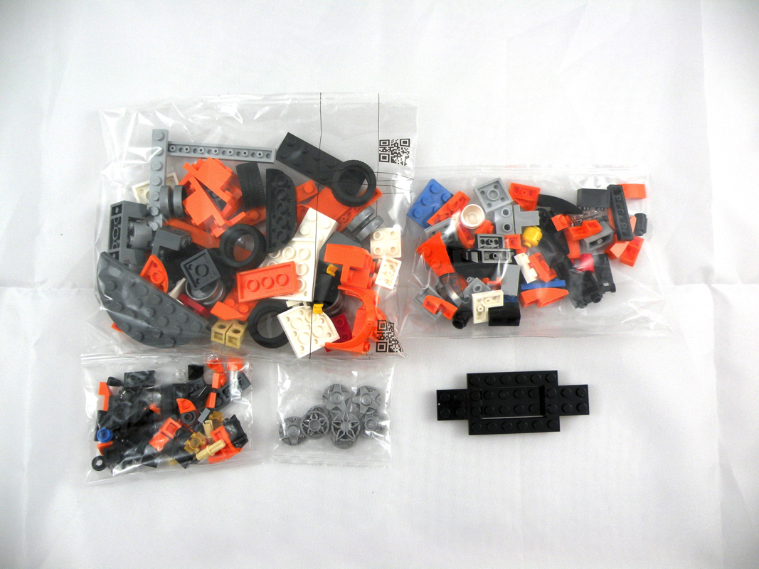 A l’intérieur, 4 sachets de pièces, dont 1 avec les jantes, et une Black Vehicle, Base 4 x 10 x 2/3 with 4 x 2 Recessed Center with Smooth Underside, qui servira de châssis à notre voiture. On termine l’inventaire avec la notice d’instructions et une planche de stickers. Ils sont au nombre de 18, relativement raisonnable par rapport à certains autres sets de la gamme.