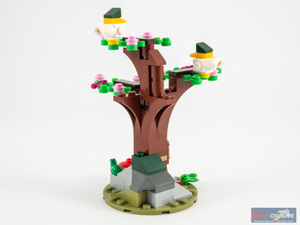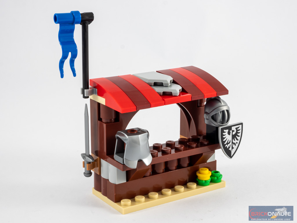 La dernière construction proposée commence par deux petits assemblages : un étal qui semble vendre ou entretenir des armures, et un arbre avec quelques fleurs. On retrouve quelques oiseaux sur les branches de cet arbre. C’est joli, mais rien de transcendant.