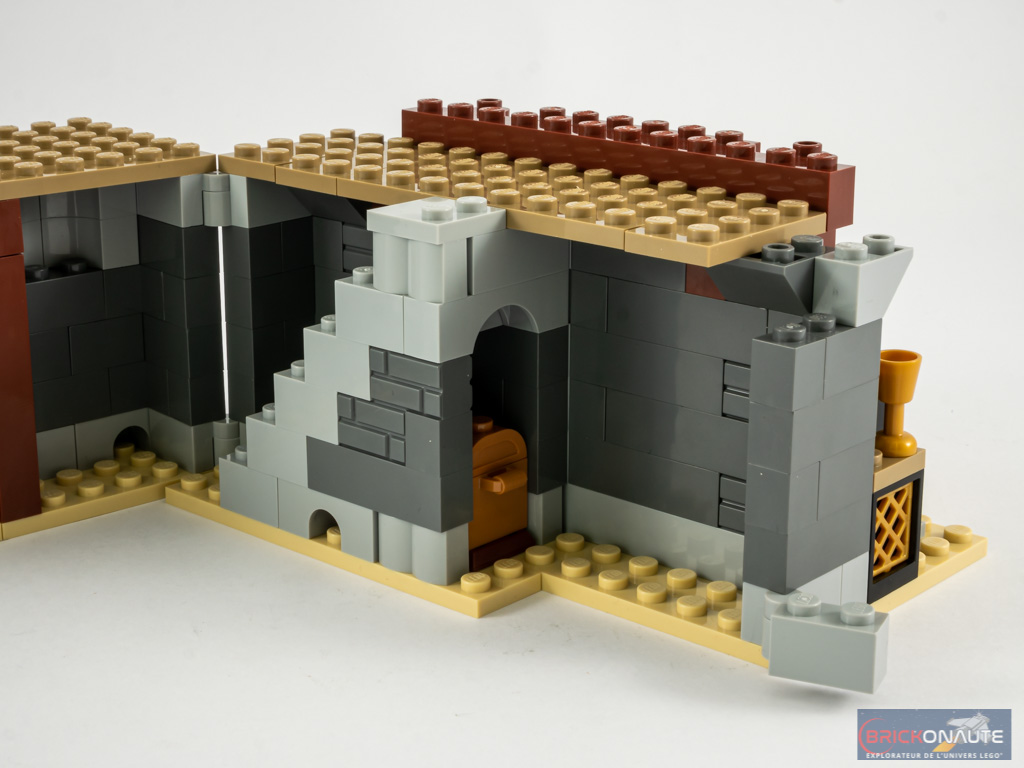 Notre château 2021 reprend les « codes » essentiels de la gamme médiévale classique : ses couleurs, ses formes et ses dimensions générales, ou encore le fait d’articuler les éléments entre eux sur des charnières pour autoriser l’accès à l’intérieur de l’édifice. Tout en y ajoutant ce qui fait les gammes LEGO modernes : des éléments nettement plus variés, autorisant une expérience de construction intéressante et un design plus soigné qu’il ne pouvait l’être « à l’époque ». L’intérieur est également nettement plus « garni » et soigné, et pour le mieux.
