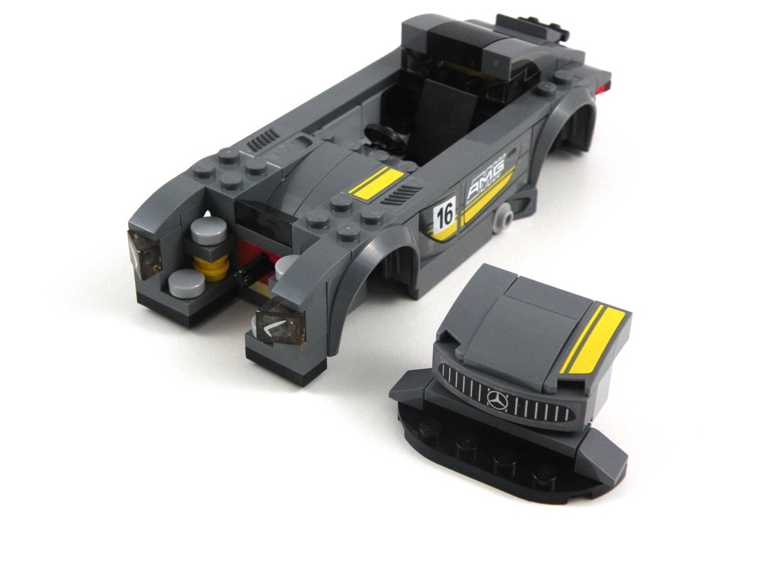 Puis c’est le capot dans sa version « course » qui vient prendre place à l’avant de la voiture, sur la barre technic laissée en attente. On remarque de suite l’aspect racé de la voiture, encore plus souligné grâce à l’abaissement apporté à l’aide de la Black Plate, Round Corner 2 x 6 Double.